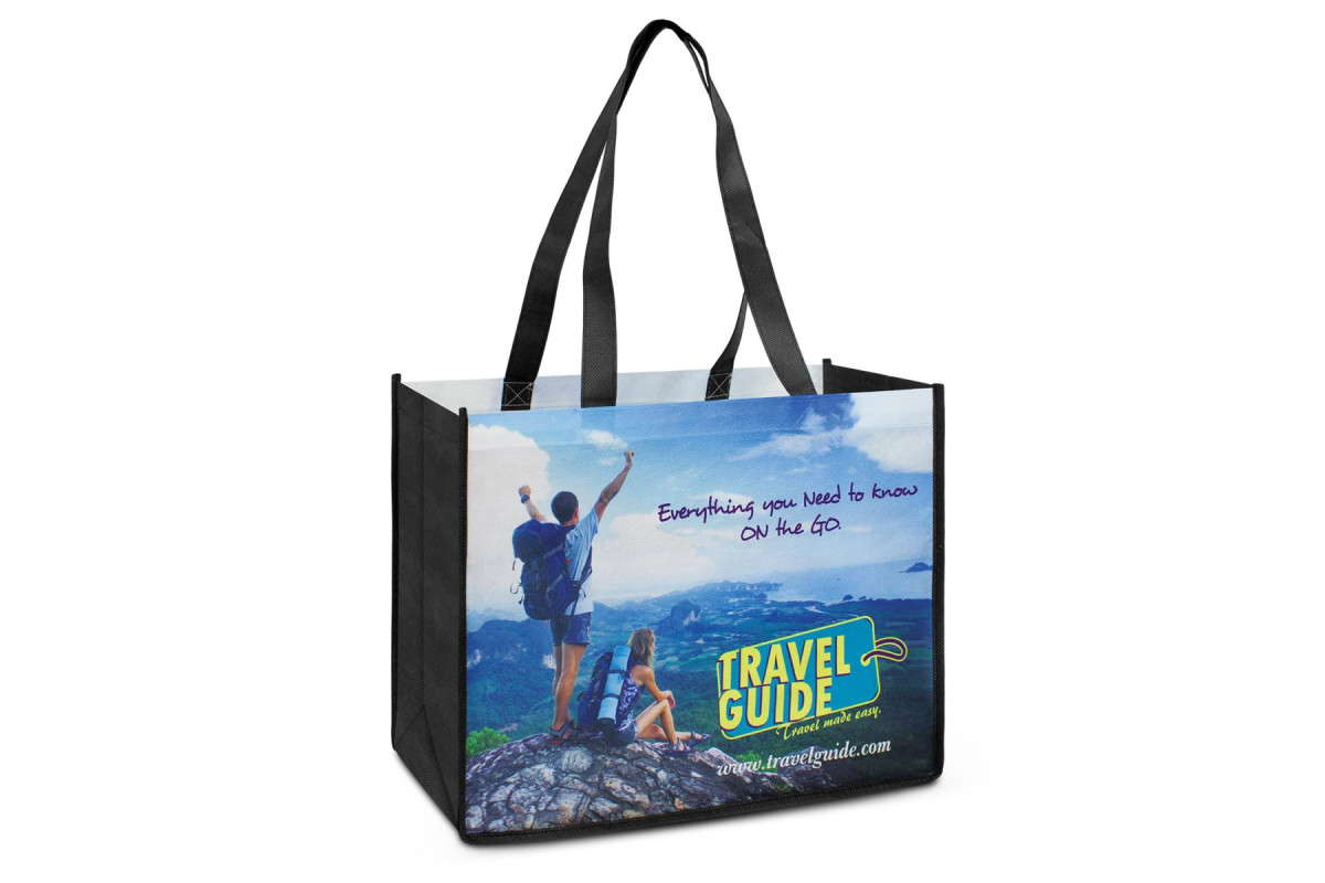 Wide tote bag with a large gusset which is manufactured from 80gsm PET. It can be branded in spot colours or full colour on both sides at no extra cost. A production lead time of 20 working days applies to this product by air freight and larger orders can be sea freighted on request to reduce the freight cost.