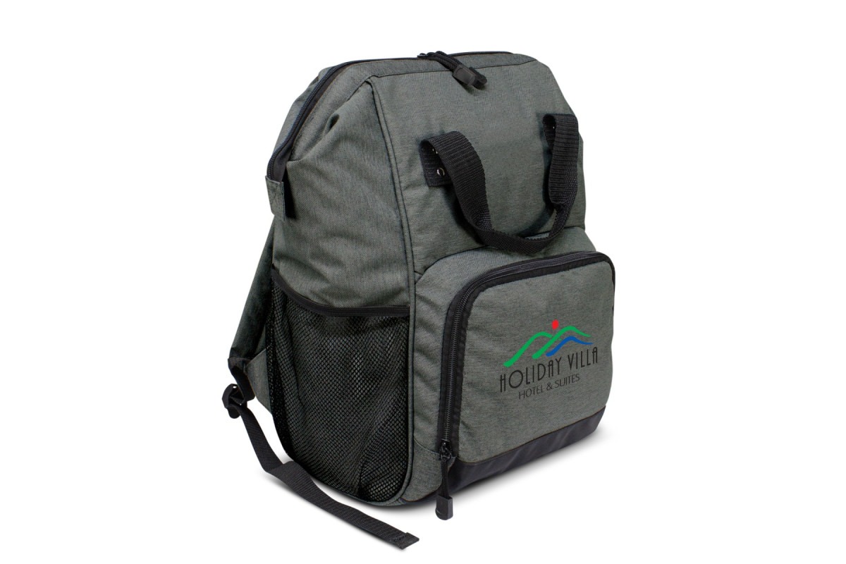Large 19L backpack cooler bag with thick PE foam insulation encased in a water-resistant PEVA inner liner. The outer construction is heather style poly-canvas with a large zippered front pocket and two side pockets, one of which is mesh. Other features include adjustable padded shoulder straps, a zippered top closure, a woven carry handle and smart zipper pulls.
