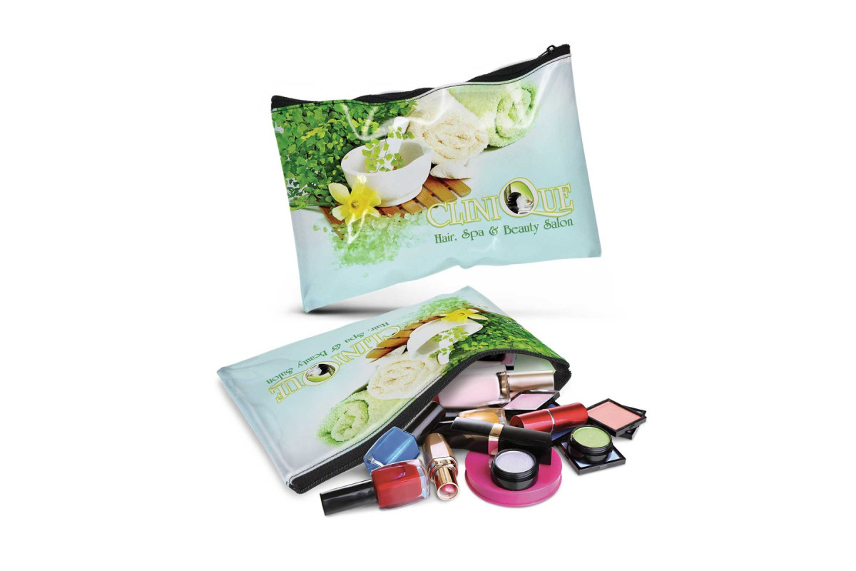 Medium size cosmetic bag which is manufactured from soft transparent plastic. It has a black zippered closure with black stitching and a polyester lining which can be branded in full colour on both sides at no extra cost. A production lead time of 20 working days applies to this product by air freight and larger orders can be sea freighted on request to reduce the freight cost.