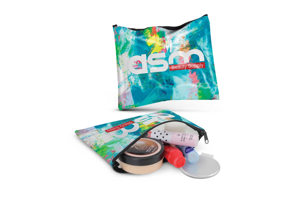 Small cosmetic bag which is manufactured from soft transparent plastic. It has a black zippered closure with black stitching and a polyester lining which can be branded in full colour on both sides at no extra cost. A production lead time of 20 working days applies to this product by air freight and larger orders can be sea freighted on request to reduce the freight cost.