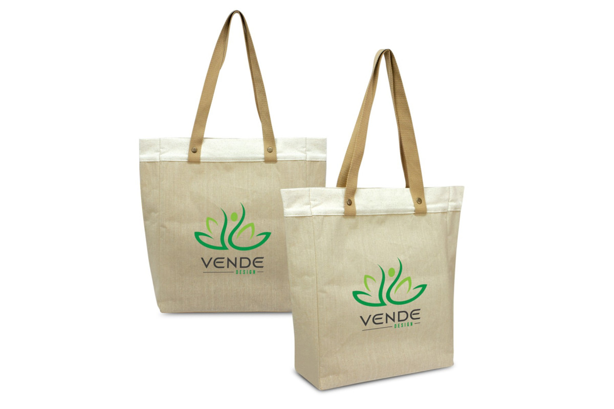 Natural laminated juco tote bag with a gusset and decorative unbleached cotton trim around the top. It has long woven carry handles that are attached with brass rivets for added strength. Juco is a versatile and popular fabric that is manufactured from a fine blend of natural jute and natural cotton.