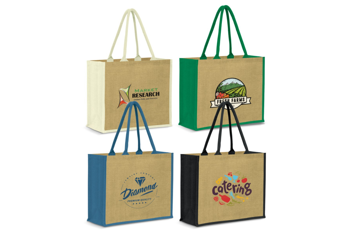 Extra-large laminated jute tote bag with a gusset and padded cotton handles. It is available in four colours where the gussets and handles are dyed to match.