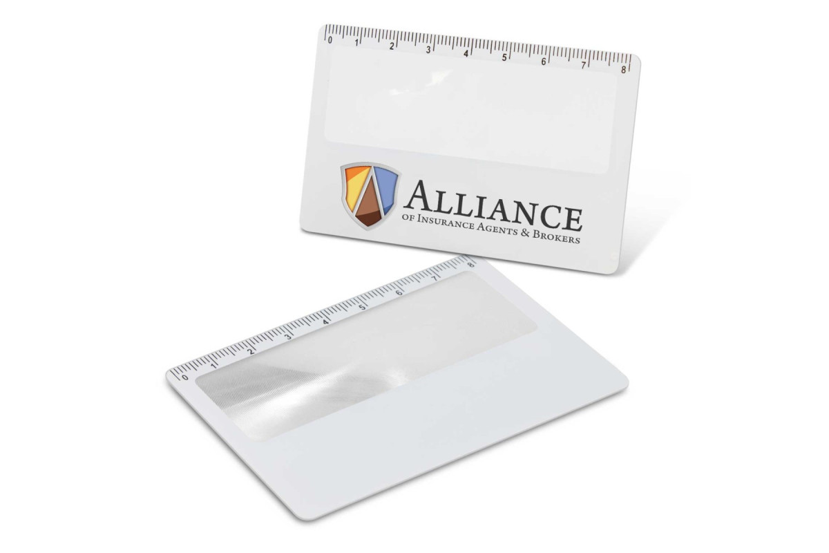 Handy credit card sized magnifier with an 8cm ruler on one edge.