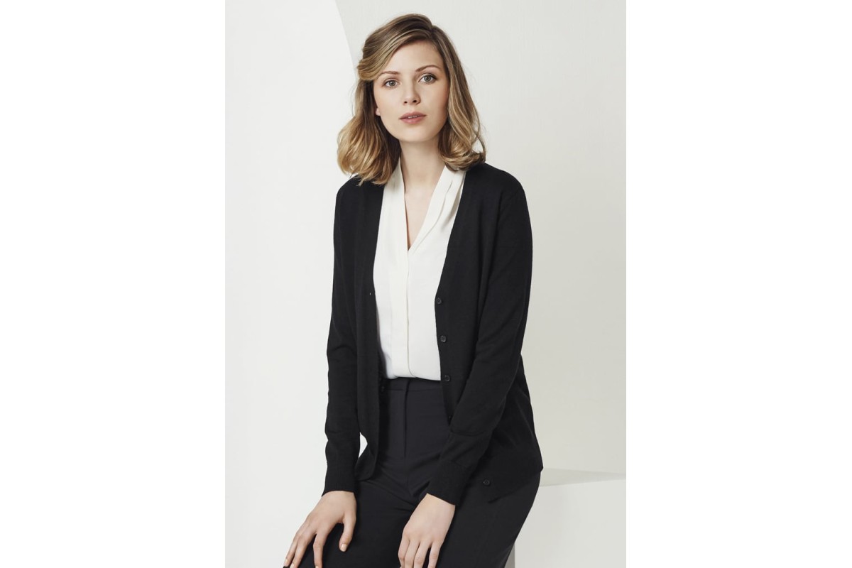 Features: Ladies modern button-through style, hip length with softly ribbed cuff and hem Fabric: 50% Merino Wool, 50% Acrylic - 14 Gauge Machine washable on wool setting Sizes: XS - 3XL