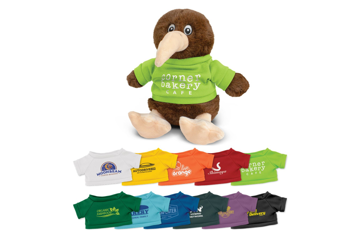 Soft kiwi plush toy with embroidered eyes, RPET filling and a polyester t-shirt which is available in eleven colours. Plush animals provide a cute and cuddly branding option and are great for brand recognition and spreading goodwill. They have also been manufactured to meet AS/NZS Safety Toy Standard.