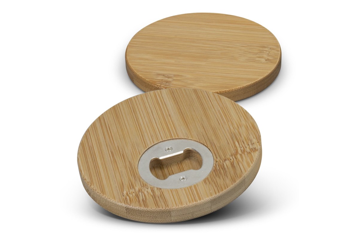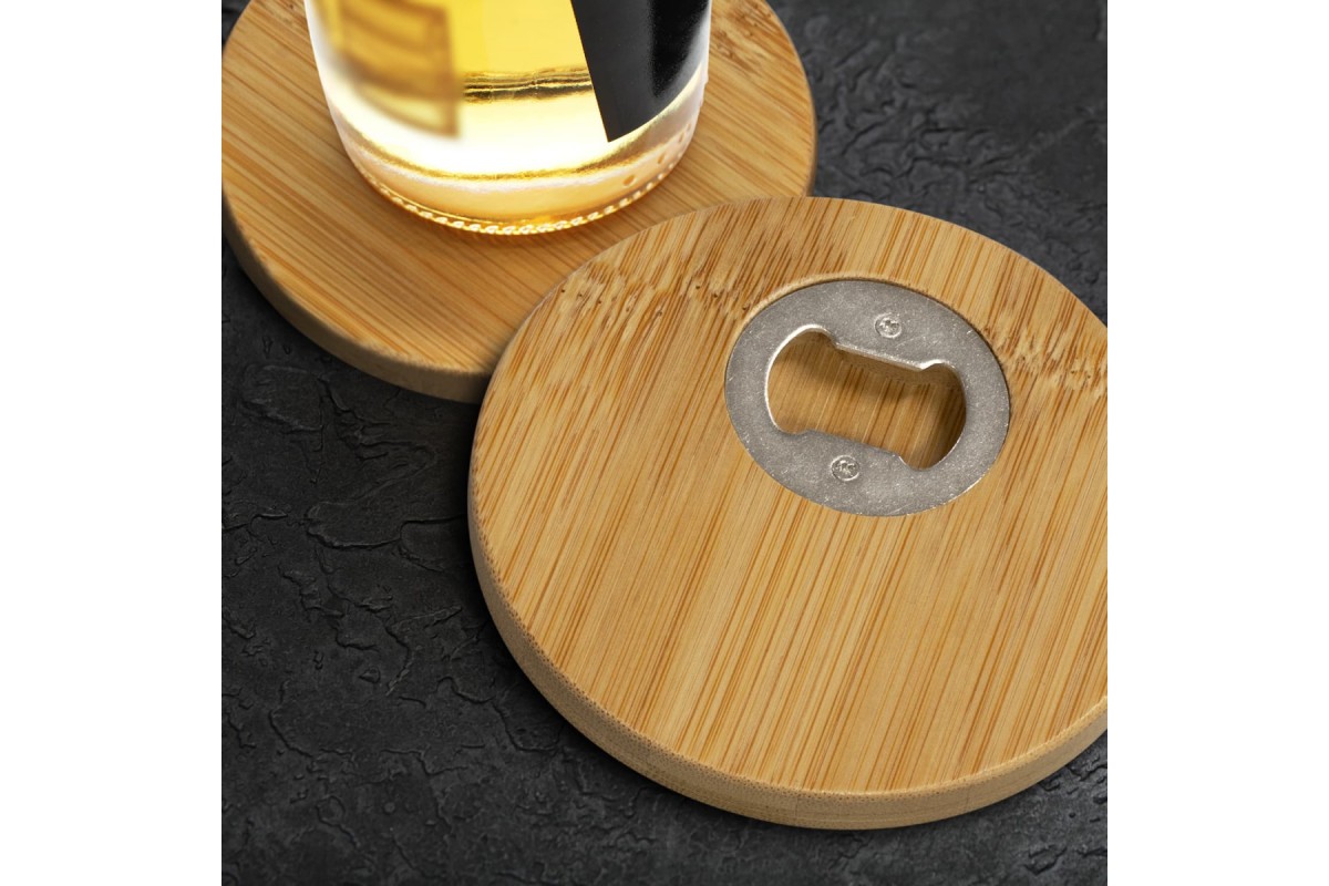 Set of two round coasters made from natural bamboo. The coasters have a smooth bamboo surface with an iron bottle opener built into the underside. The set is presented in a natural gift box.
