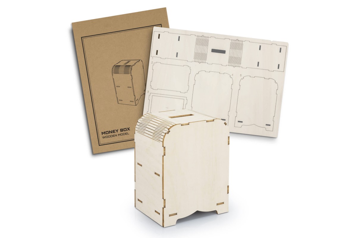Step into a world of creativity and craftsmanship with BRANDCRAFT's wooden models. Designed to unleash the inner child in any audience, this fully functional model money box is expertly laser cut from an A4 sheet of Basswood, a lightweight and strong wood perfectly suited for crafting. The interlocking design means that pieces easily slot together and no tools are needed for assembly. Presented in a brandable cardboard sleeve with assembly instructions, this is an engaging promotional product or gift for adults and children alike. Add your brand to the natural Basswood material or add your brand and colours to the default digital template to bring your brand to life.