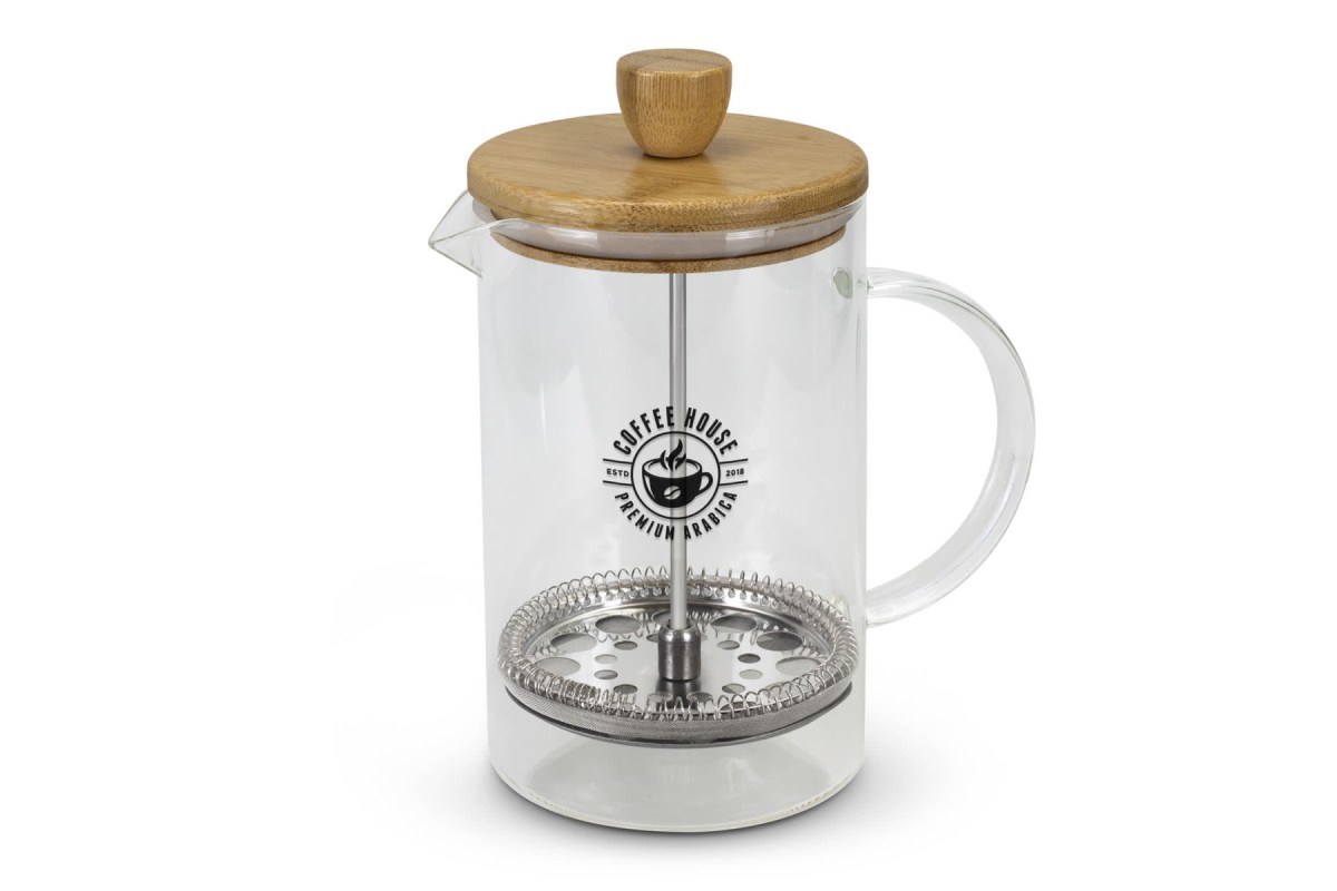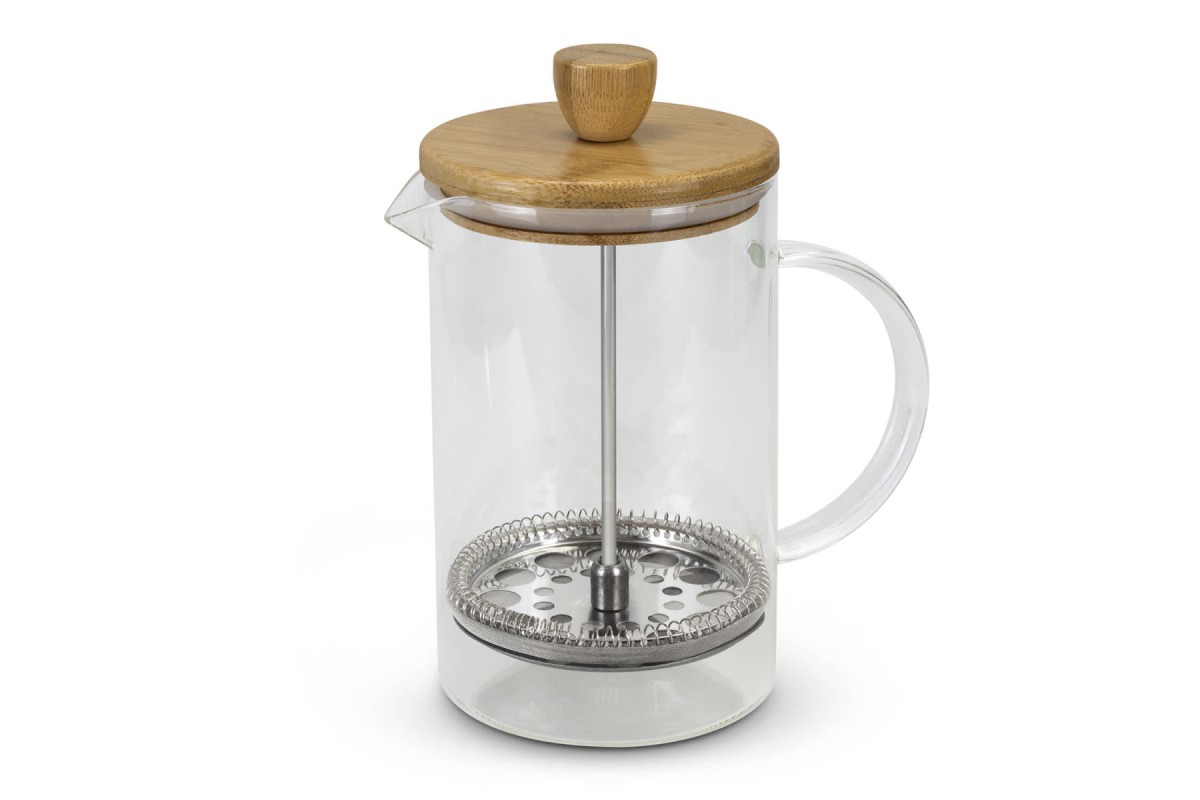 Stylish 850ml coffee plunger made from borosilicate glass with a comfortable round handle. The plunger features a natural bamboo lid with a silicone seal, and is presented in natural kraft gift box with NATURA branding.