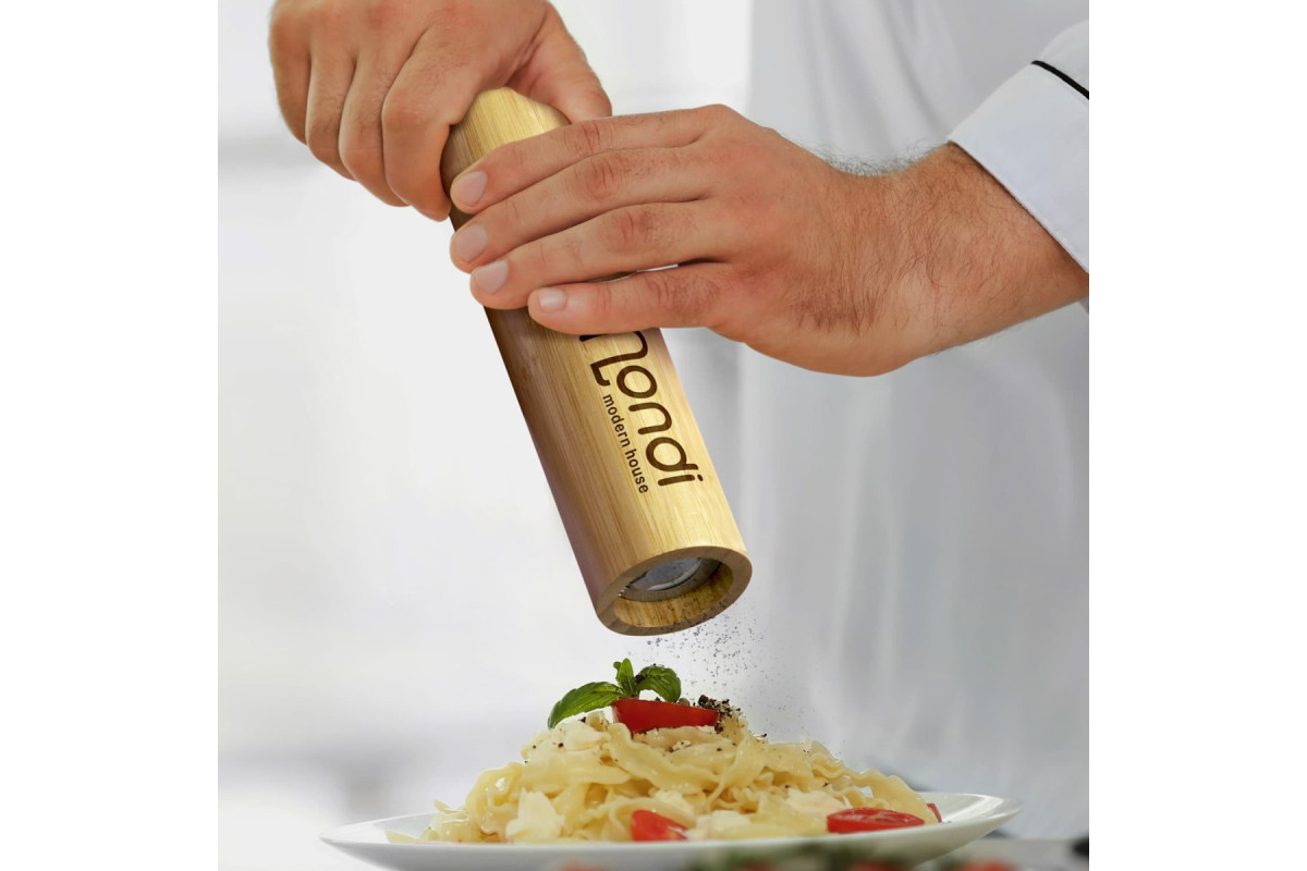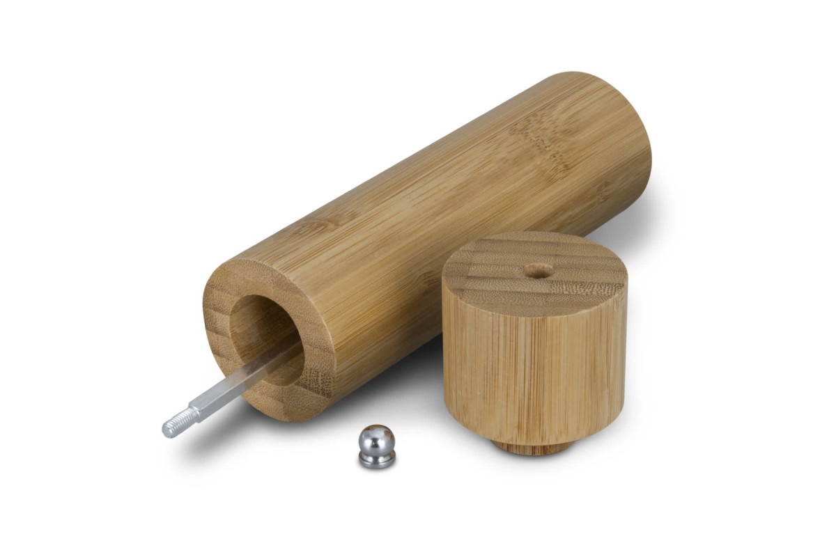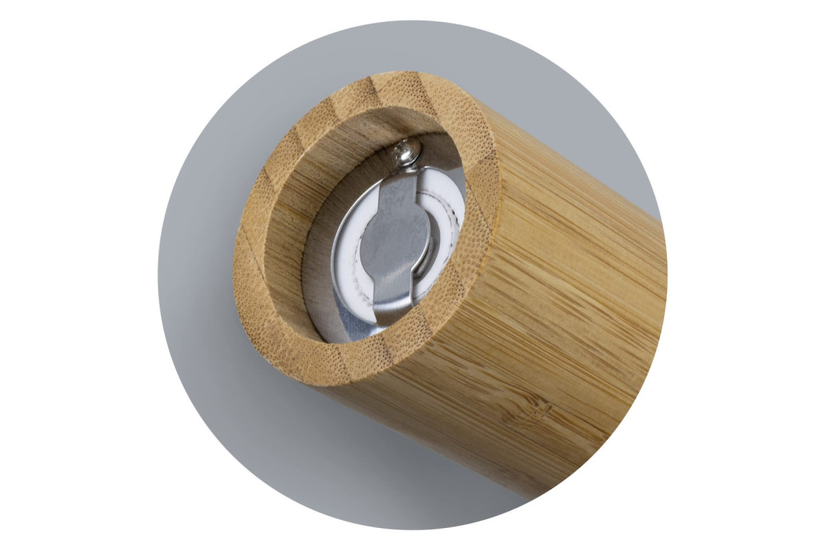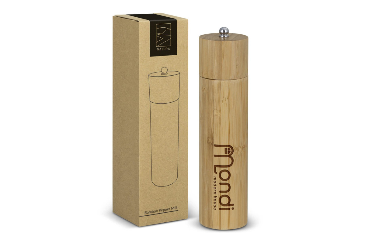 Functional natural bamboo compact pepper mill. The 304 stainless steel and ceramic mill is a durable and efficient grinder, and the adjustable grind allows you to set the coarseness of your pepper to your preference. The mill comes in natural kraft gift box with NATURA branding.