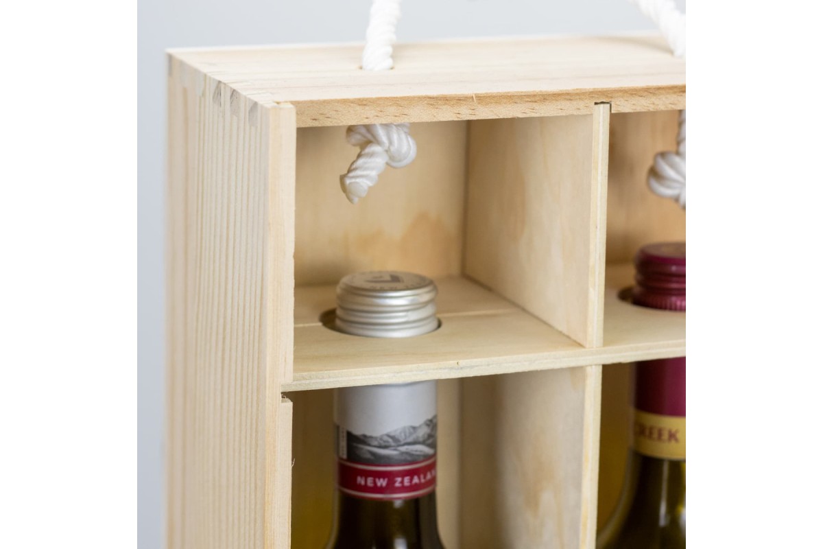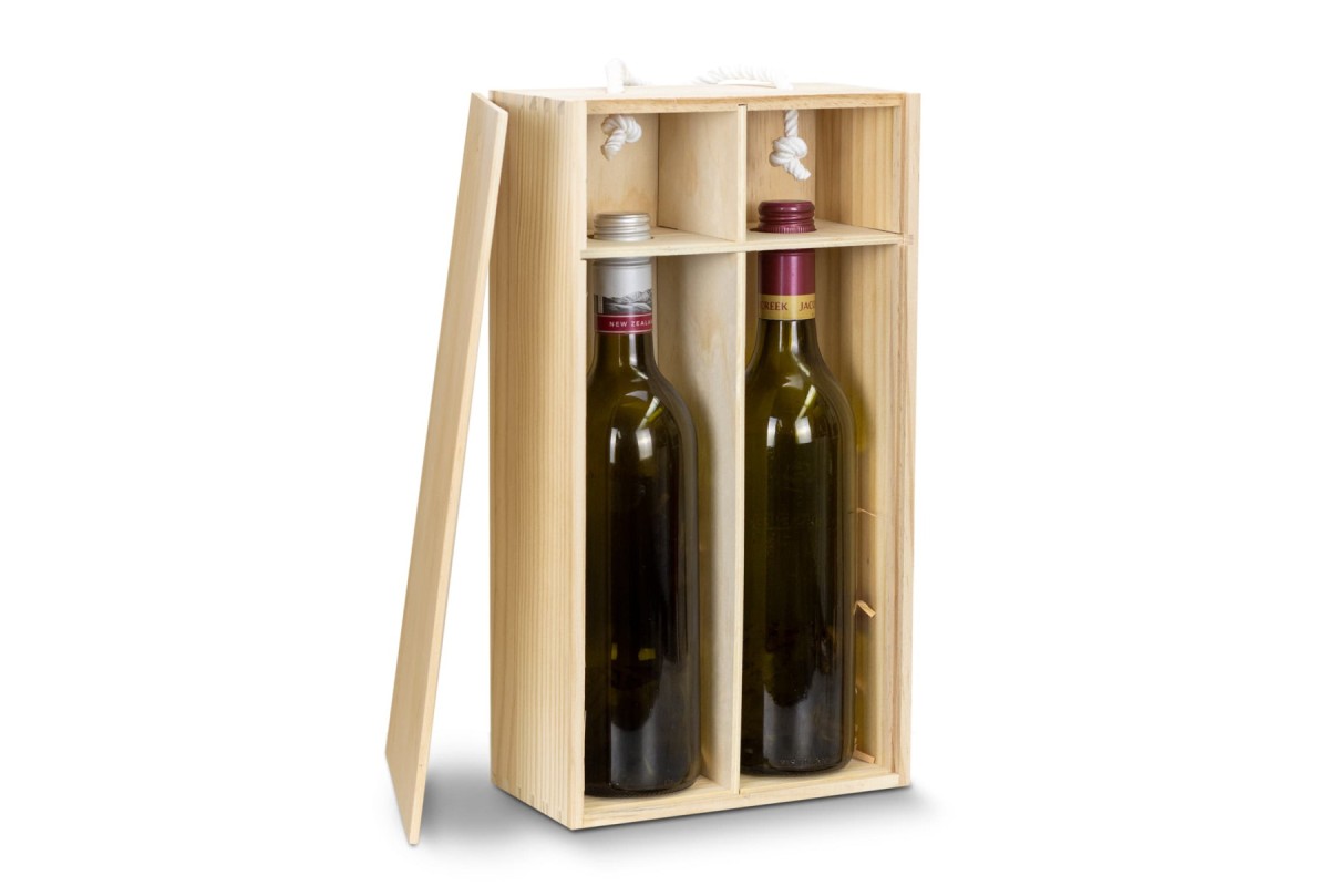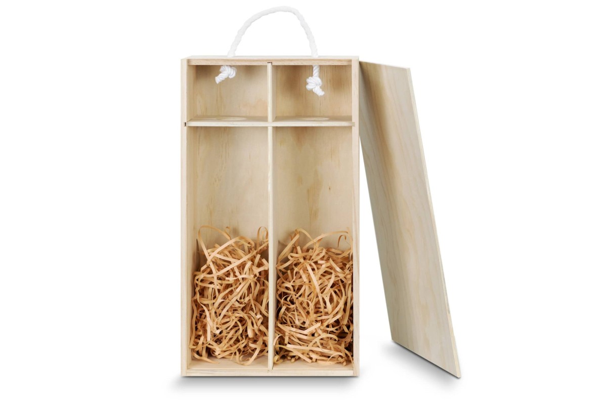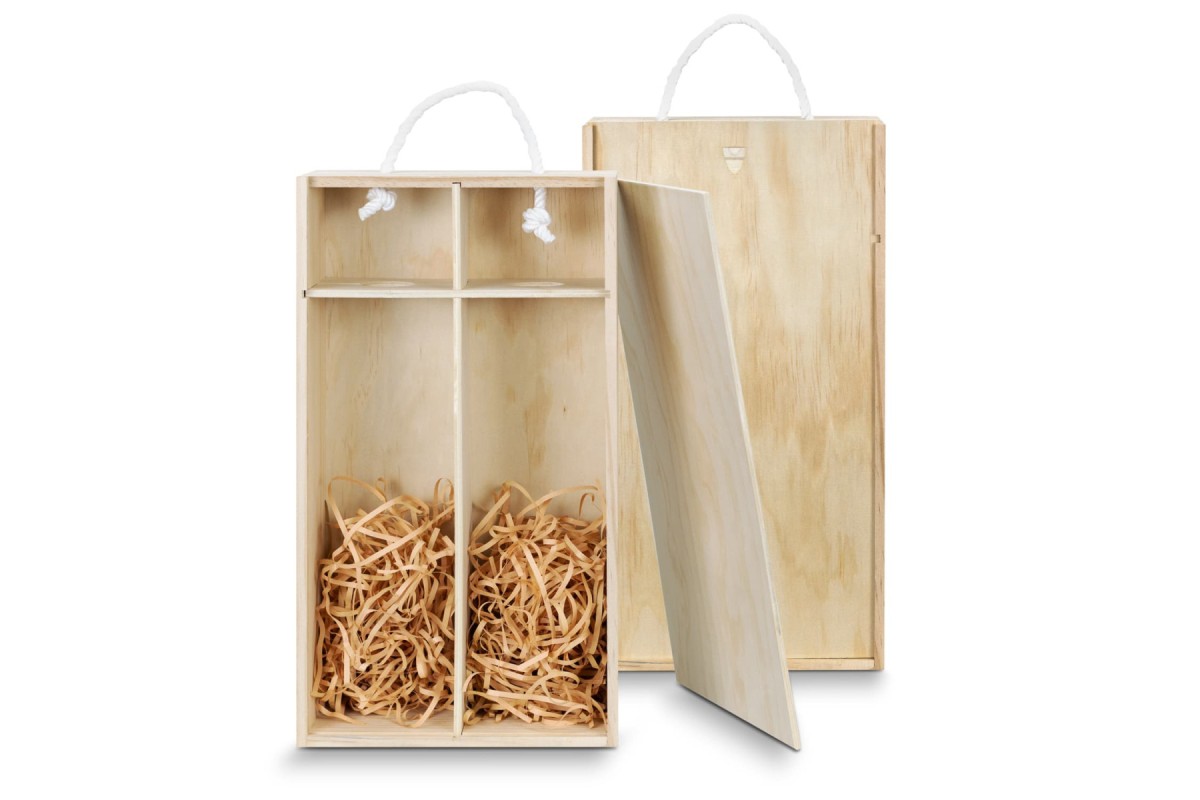 Elegant wine gift box made from natural pine wood with a sliding lid that offers a large branding area. The box is designed to hold two standard wine bottles and has built-in dividers with shredded paper filling. A woven cotton rope handle makes it easy and comfortable to carry. Features: * Elegant wine gift box that will fit two standard wine bottles * Made from natural pine wood with built-in dividers * Sliding lid closure offers a large branding area * Shredded paper filling * Woven cotton rope handle