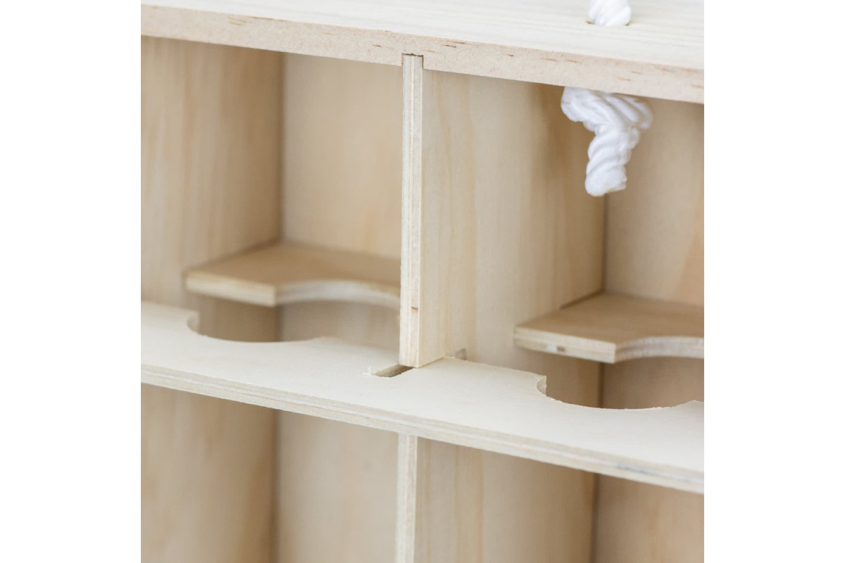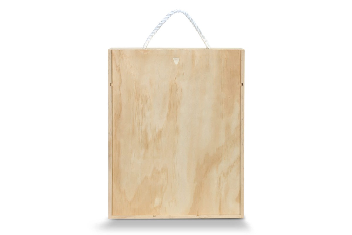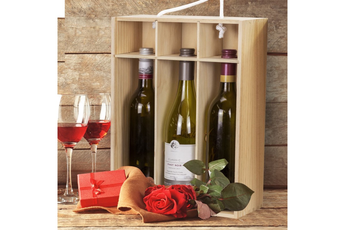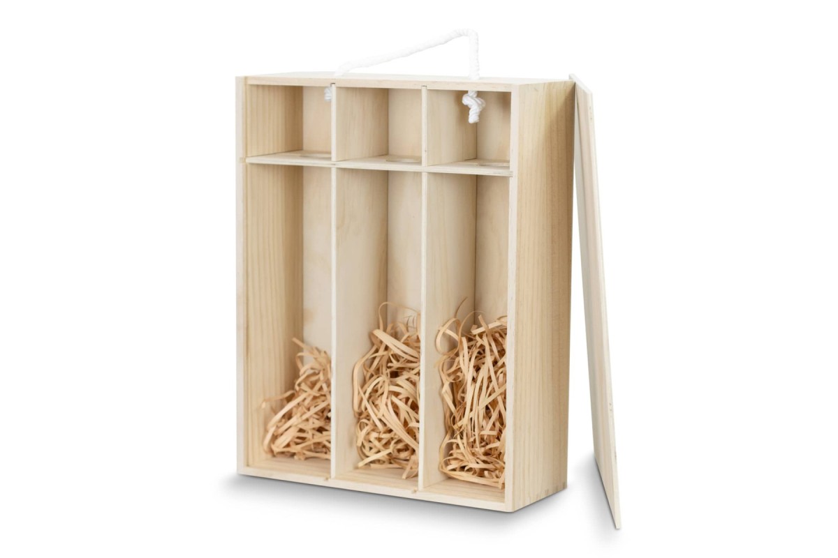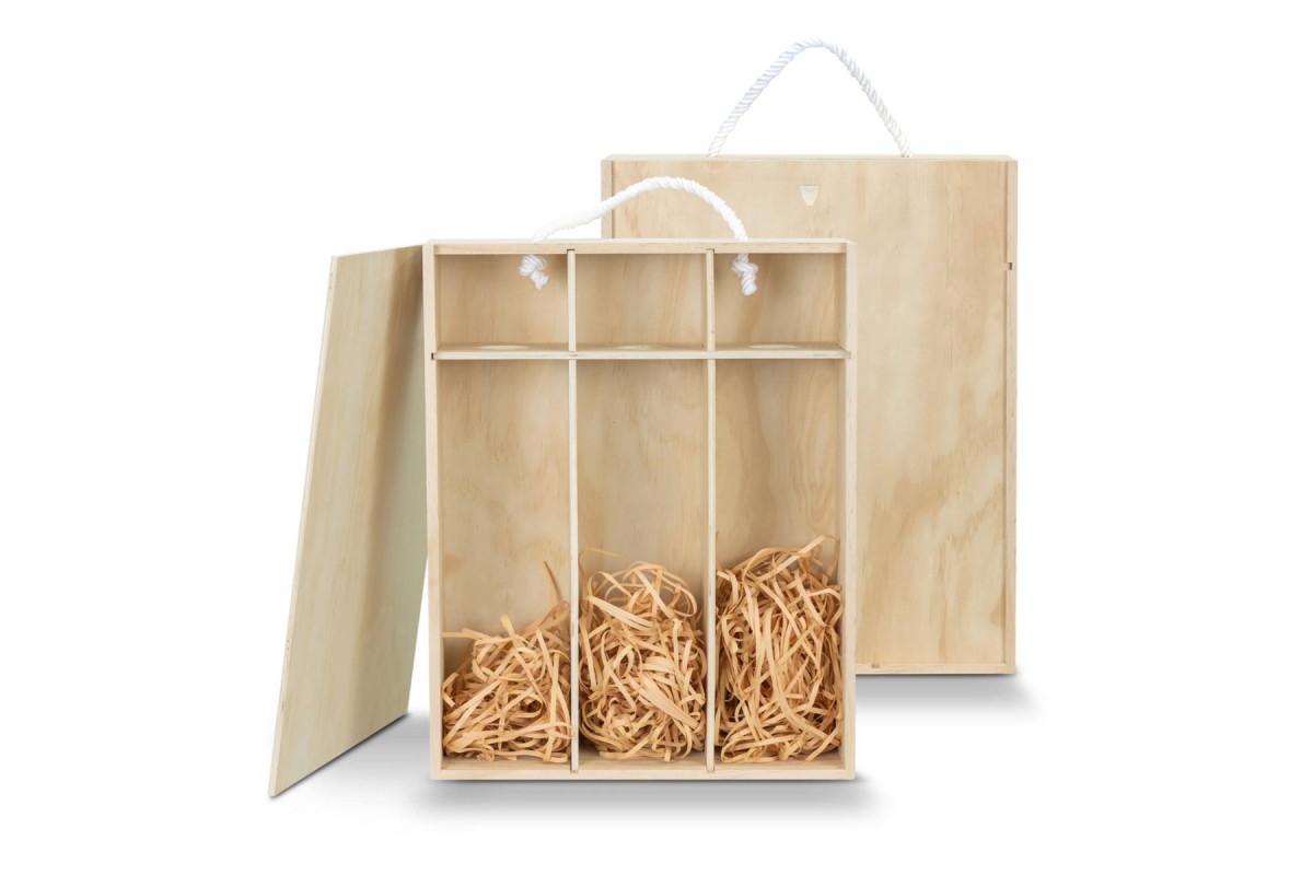Elegant wine gift box made from natural pine wood with a sliding lid that offers a large branding area. The box is designed to hold three standard wine bottles and has built-in dividers with shredded paper filling. A woven cotton rope handle makes it easy and comfortable to carry. Features: * Elegant wine gift box that will fit three standard wine bottles * Made from natural pine wood with built-in dividers * Sliding lid closure offers a large branding area * Shredded paper filling * Woven cotton rope handle