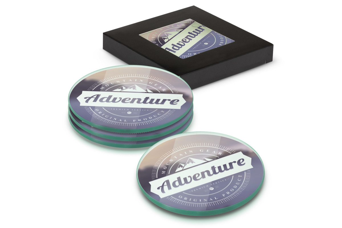 Set of four round glass coasters in a stylish black gift box with a window to show off the brand. The coasters have three non-marking polyurethane pads on the base. The branding is on the underside of the coaster and handwashing is recommended.