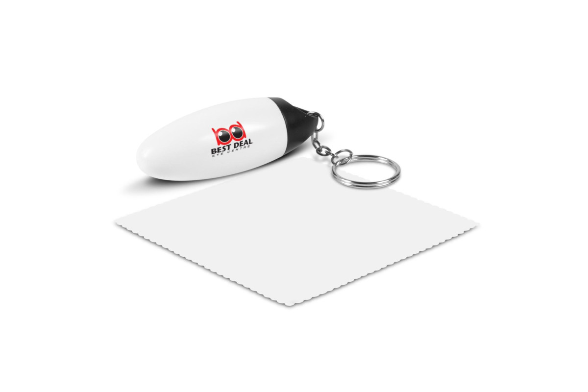 Capsule key ring which contains a microfibre cloth for cleaning screens and eyewear. Branding is on the capsule.