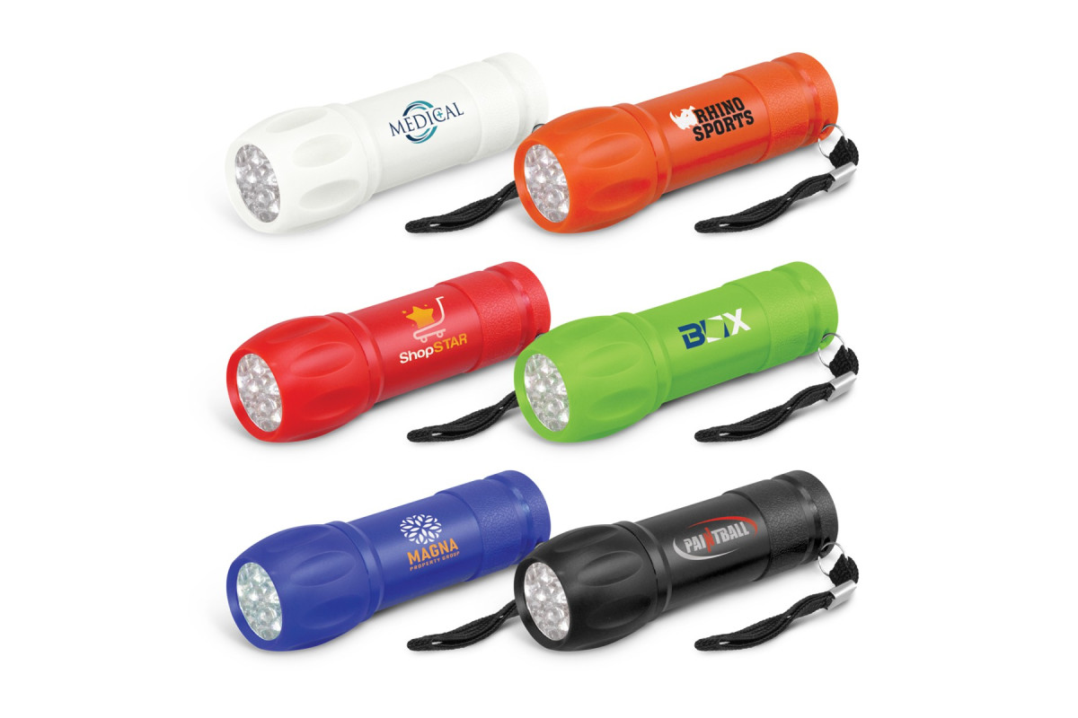 Compact torch with nine powerful LEDs and a woven strap. It is powered by three AAA batteries which are included. Features: * Compact torch with a handy woven strap * Nine powerful LEDs * Uses three AAA batteries (included)