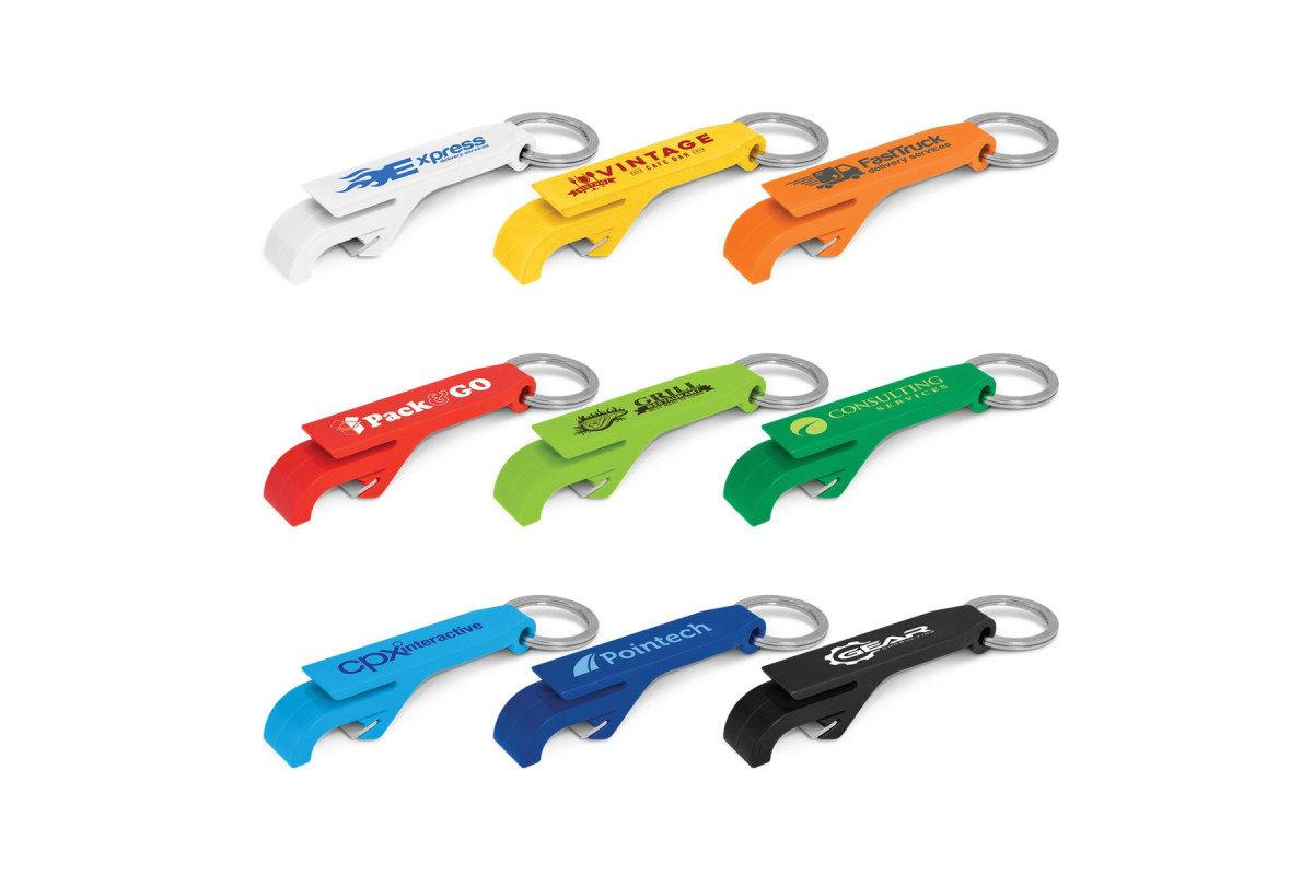 Compact plastic bottle opener with a key ring and a handy tab slot for opening cans.