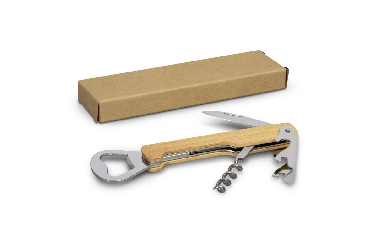 Crafted from stainless steel and beech wood, this wine waiter's knife combines elegance with practicality. Its multi-function design features a built-in bottle opener, corkscrew, and foil cutter, making it an essential tool for wine lovers. Presented in a natural kraft gift box. Features: * Wine waiter's knife made from stainless steel and beech wood * Multi-function design featuring a built-in bottle opener, corkscrew, and foil cutter * Presentation: Natural kraft gift box