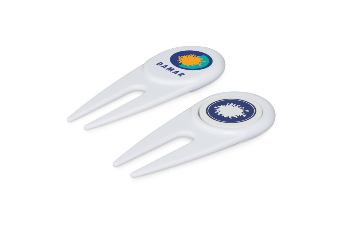 Plastic divot repairer with a metal golf ball marker which is securely held in place with a strong magnet.