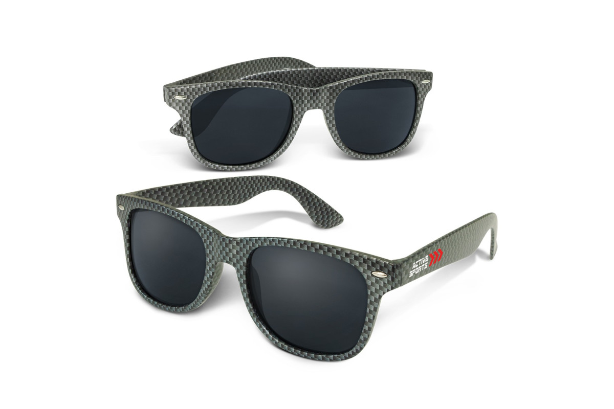 Retail quality sunglasses with an impact-resistant polycarbonate frame and arms. Both the frame and arms are finished with a stylish carbon fibre pattern. They are fitted with CE standard 100% UV400 lenses which provide both UVA and UVB protection. Malibu can be presented in a microfibre pouch for an additional cost. Features: * Sleek retail quality inspired design, with the benefits of sun protection * Made from impact resistant polycarbonate ensuring durability and performance * UV400 lenses provide UVA and UVB protection * Presentation: Optional microfibre pouch at an additional cost