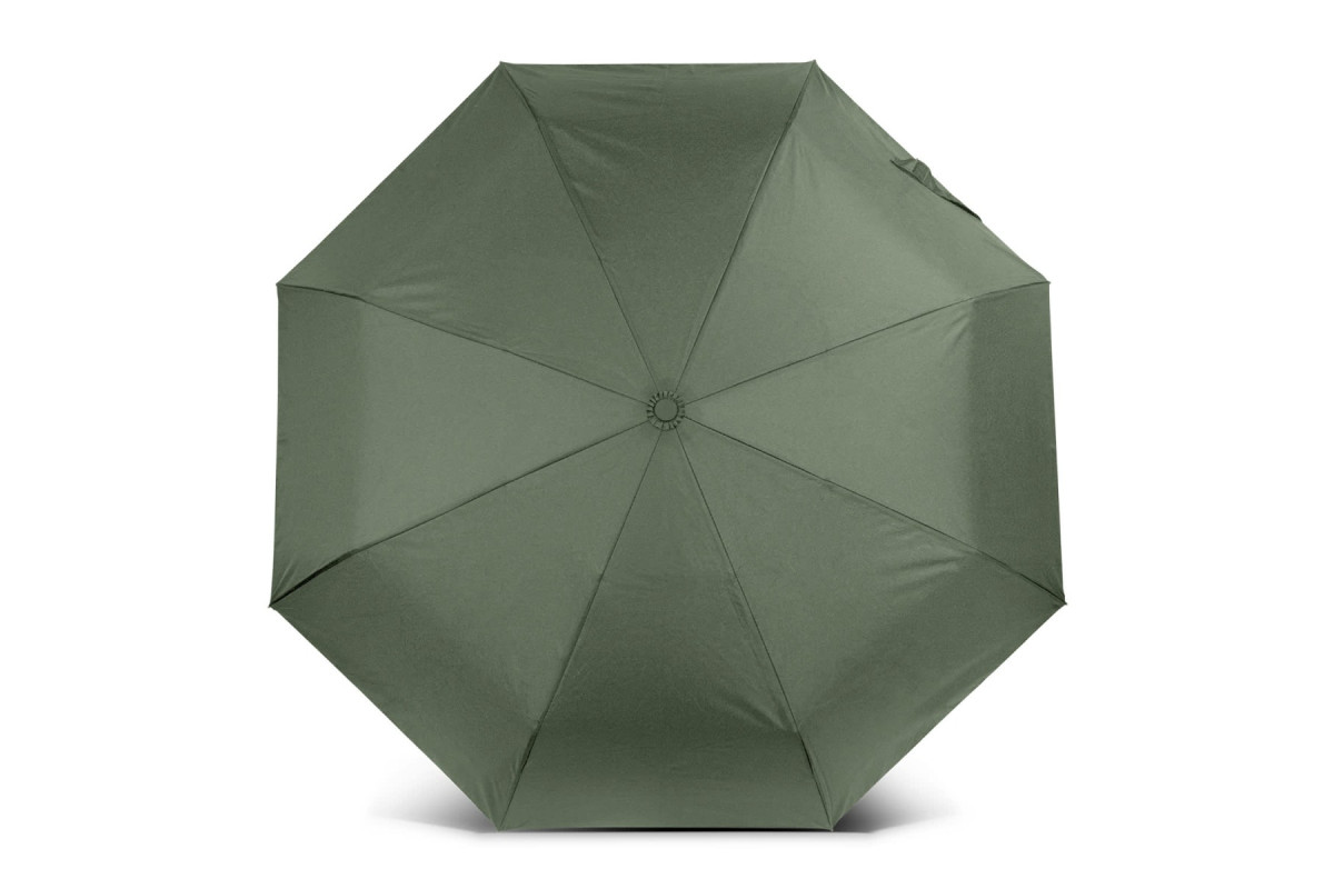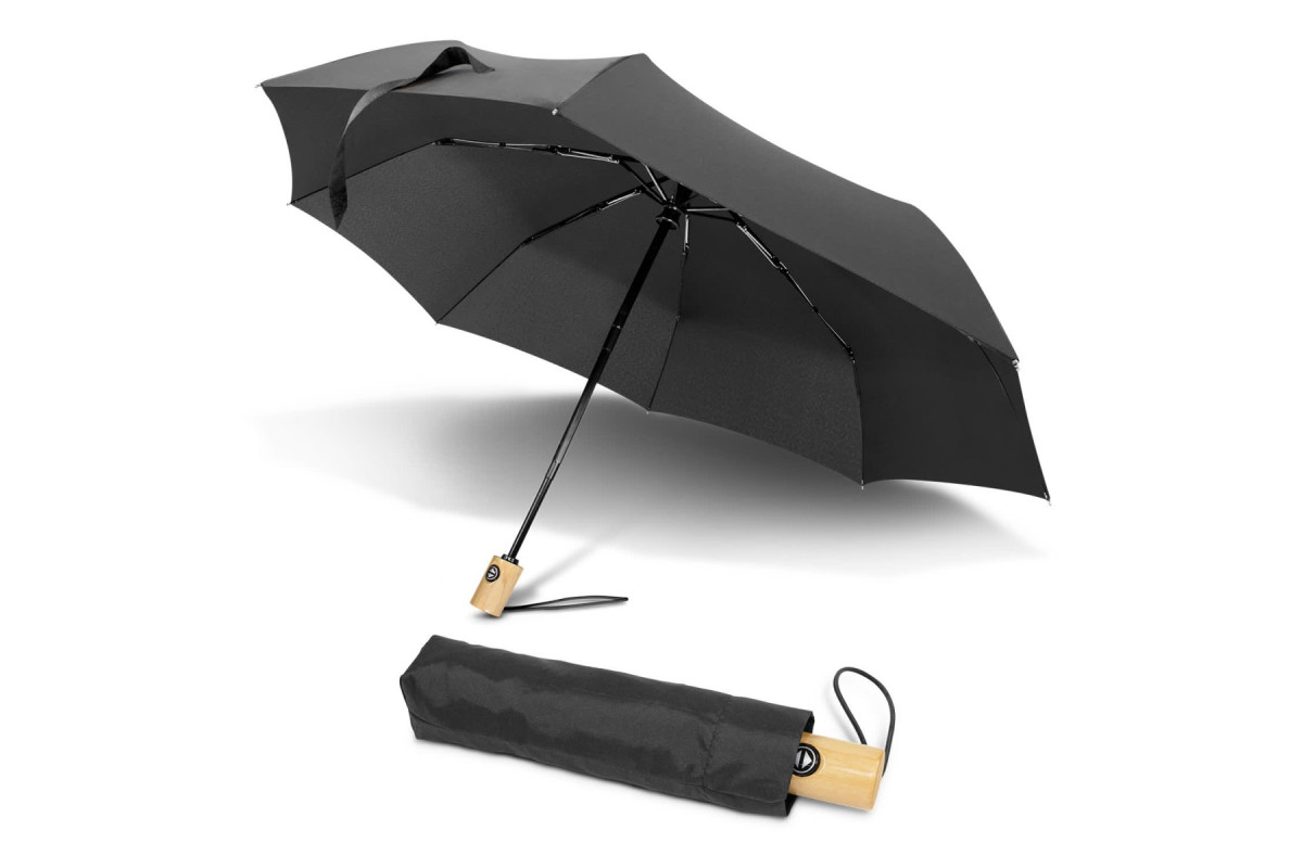 Compact 54cm, triple-folding umbrella with an eight-rib frame and automatic opening and closing. The eight-panel canopy is manufactured from 190T RPET (recycled PET) pongee, produced by recycling used water bottles and food packaging. It has 54cm fibreglass ribs and a steel shaft and folds down to a compact 28cm. It has a matching pongee sleeve and a Japanese oak wooden handle.