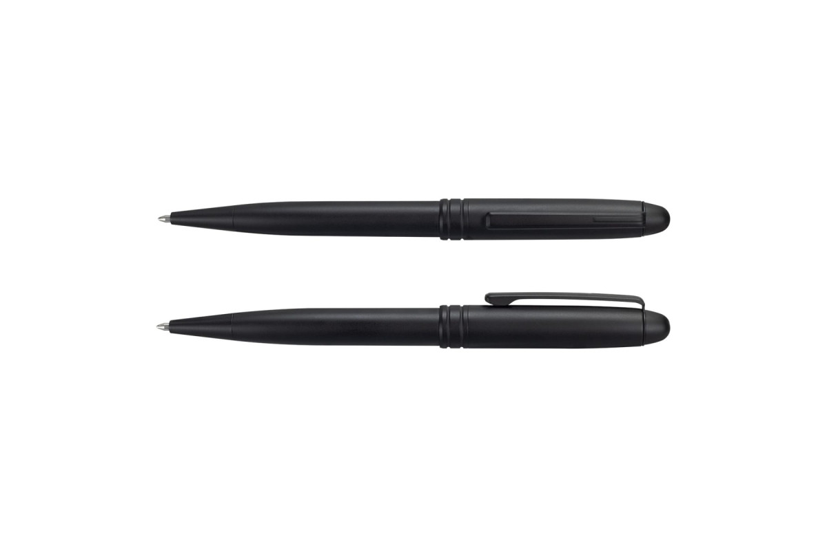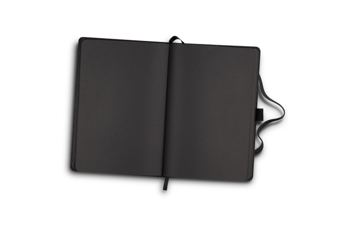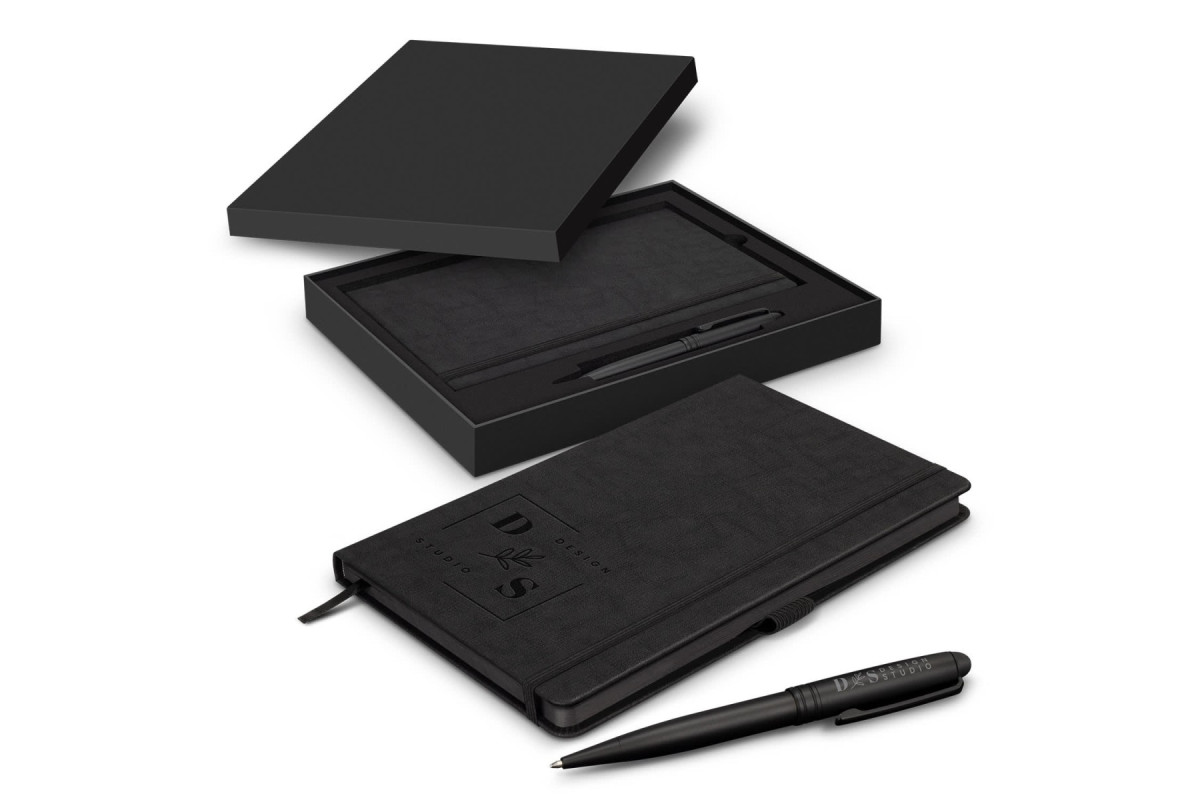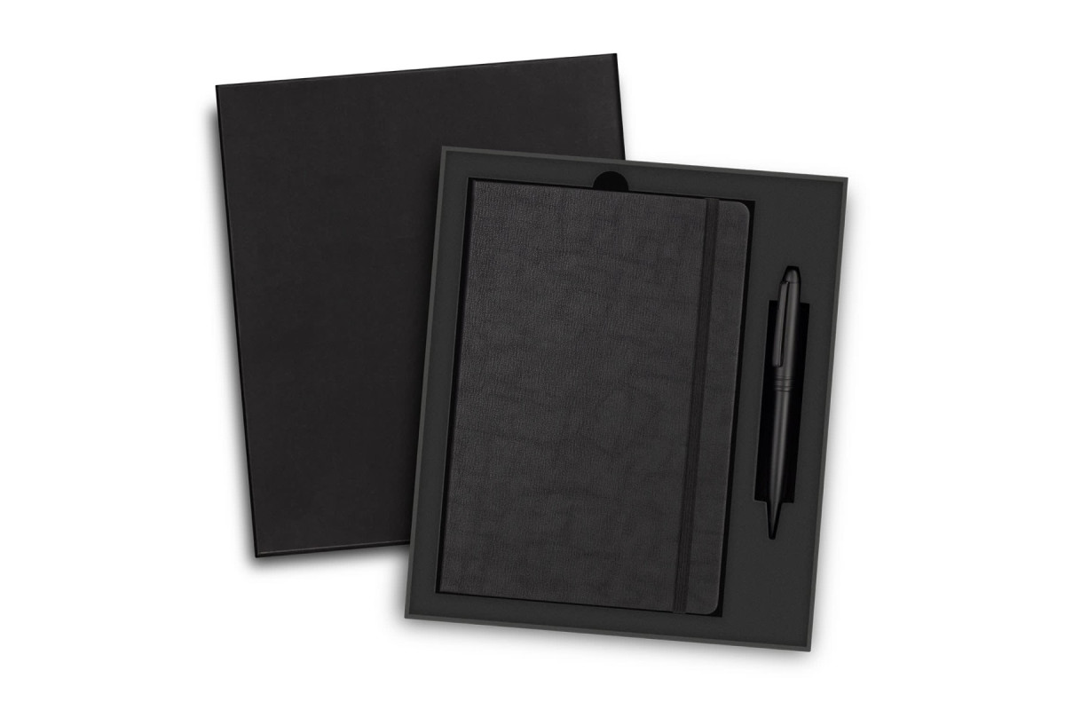Luxurious notebook and pen gift set with matte black theme, beautifully presented in a black gift box. The hard cover medium-size (approximately A5) notebook has 80 leaves (160 pages) of unique black 110gsm unlined paper, a thermo PU cover, an elastic closure and a bookmark ribbon. The metal twist-action ballpoint pen has a lacquered matte black barrel, metal trim and 130m of silver gel ink. The Onyx Writing set also includes three spare pen refills. Features: * Luxurious black writing set * Notebook: Thermo PU hard cover * Notebook: 80 leaves of 110gsm black unlined paper * Pen: Matte black twist-action metal ballpoint pen * Pen: 130m of silver gel ink with three spare refills * Presentation: Black gift box