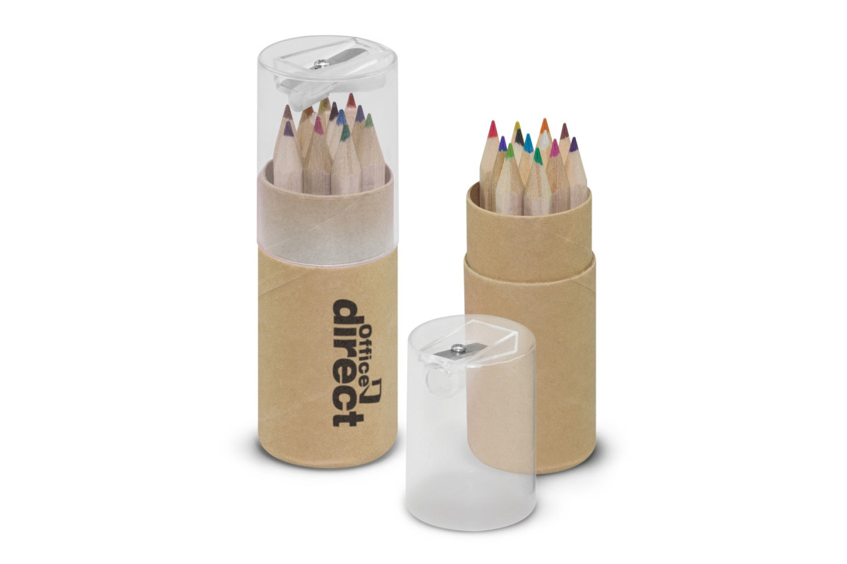 12 assorted colour pencils in a convenient unbleached cardboard tube with a translucent plastic cap which features a built-in pencil sharpener.