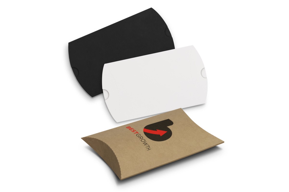 This small pillow box is ideal for gifting or presenting small items and boosting brand recognition. It includes a finger grip for easy opening and pre-creased edges for simple assembly. The long, flat panels provide ample space for branding with a CMYK digital print process. Supplied flat for convenient postage and storage. Features: * Perfect presentation for small items * Versatile packaging option * Pre-creased edge for easy assembly * 300gsm kraft material