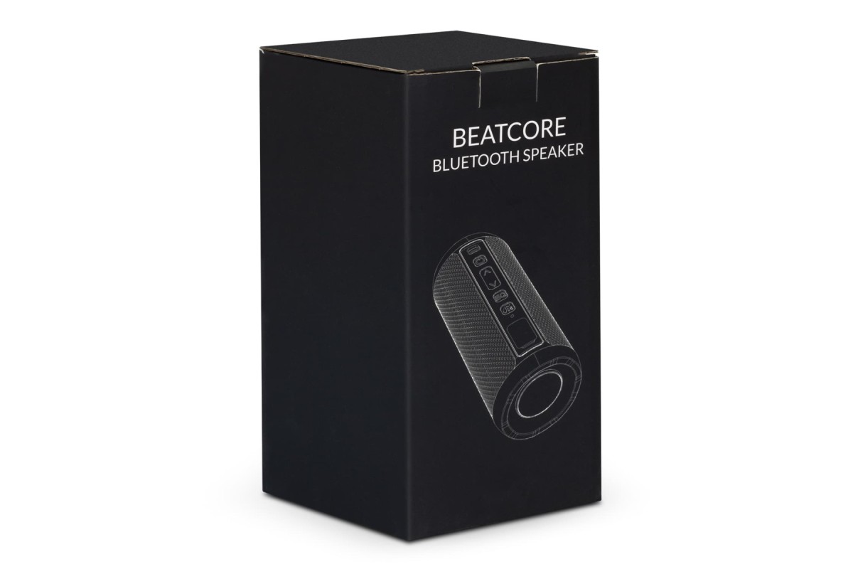 Premium water-resistant Bluetooth speaker with a hard-wearing design, perfect for outdoor use. Beatcore has two 6W speaker outputs, and music can be played for up to five hours via Bluetooth, AUX or Micro-SD card. The speaker has music, volume and hands-free controls and a built-in light display at either end of the speaker showcases the two branding areas. The speaker recharges in three hours and is presented in a printed black gift box with instructions and a charging cable. Features: * Premium water-resistant bluetooth speaker with light displays * Input: Bluetooth, AUX, Micro-SD * Play music for up to five hours * Output: Two 6W speakers * Music, volume and hands-free controls * Presentation: Black gift box with product branding