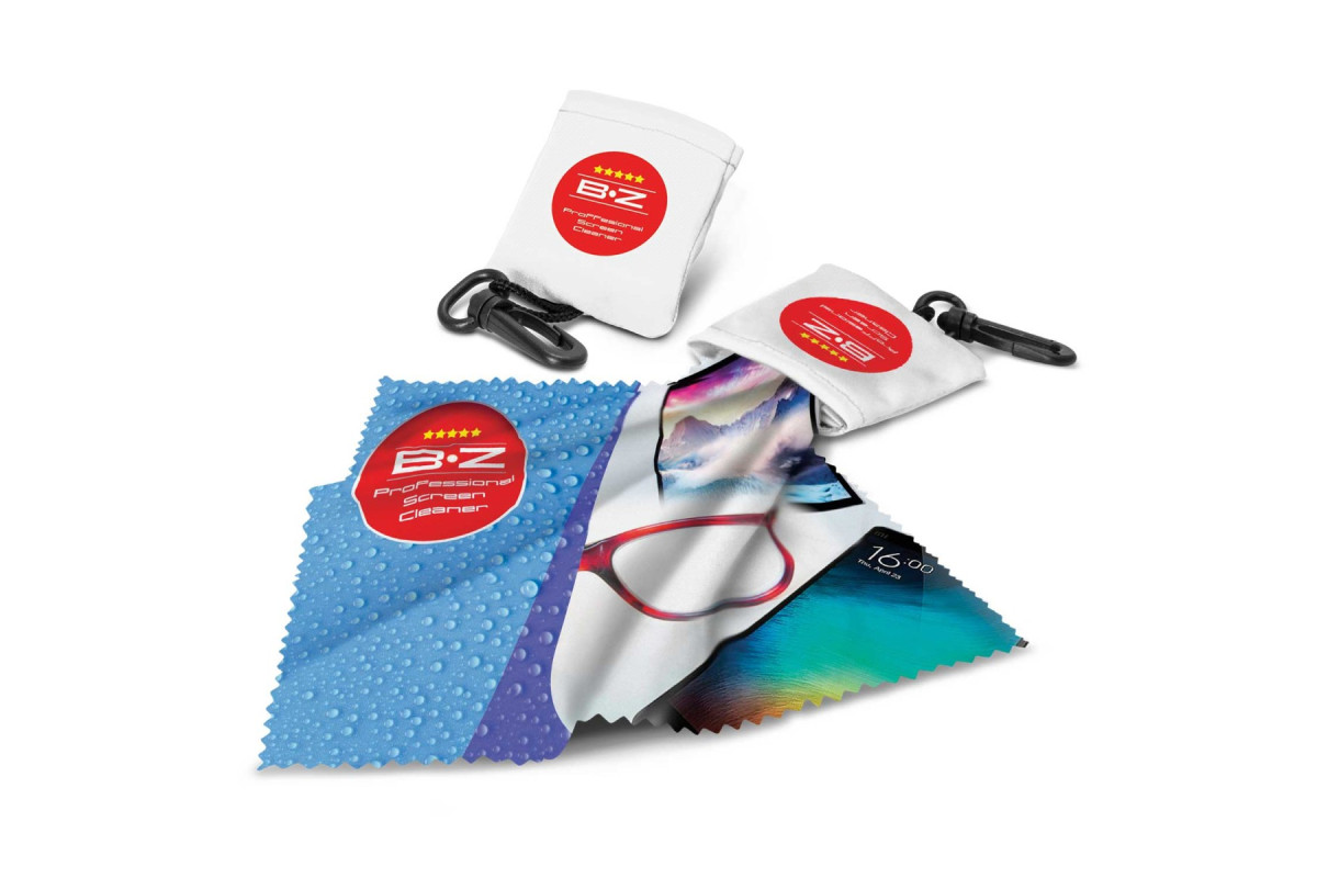 150mm square microfibre screen cleaning cloth which folds away into a compact pouch with a clip. It is ideal for attaching to a key ring or a bag so it is always available when needed. The screen cleaner is branded on one side in spot colours of full colour and the pouch is branded on both sides in spot colours or full colour. A production lead time of 20 working days applies to this product by air freight and larger orders can be sea freighted on request to reduce the freight cost.
