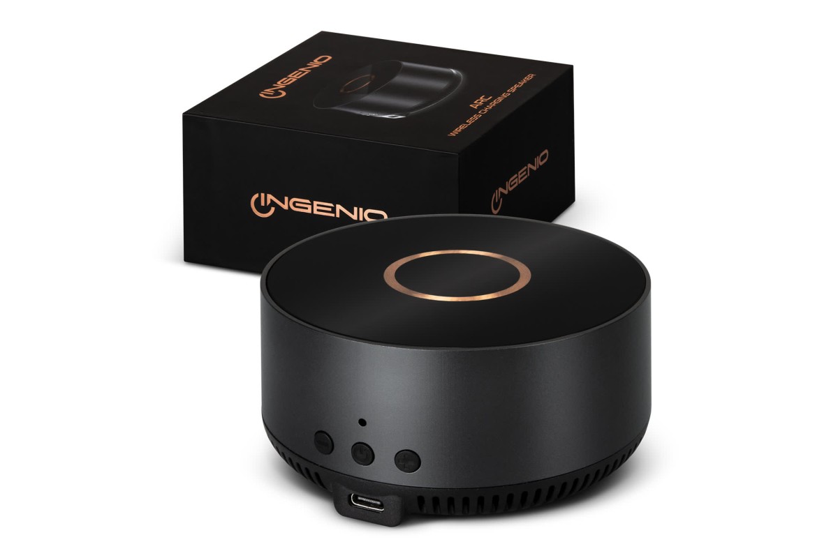 The Arc Wireless Charging Speaker blends innovation with elegance to deliver quality performance. Designed to seamlessly integrate into everyday life the speaker features both Bluetooth connectivity and wireless charging capabilities. Offering high-quality sound alongside intuitive functions, including track navigation, call management, and number recall, the speaker also boasts an LED light ring on the base to indicate charging status. The sleek black glass finish, refined copper accents, and quality components make the Arc Wireless Charging Speaker a standout accessory. Presented in a beautifully crafted INGENIO gift box, it is ideal for corporate gifting, and the ultimate brand statement. INGENIO - Designed to lead, built to last, made to inspire.