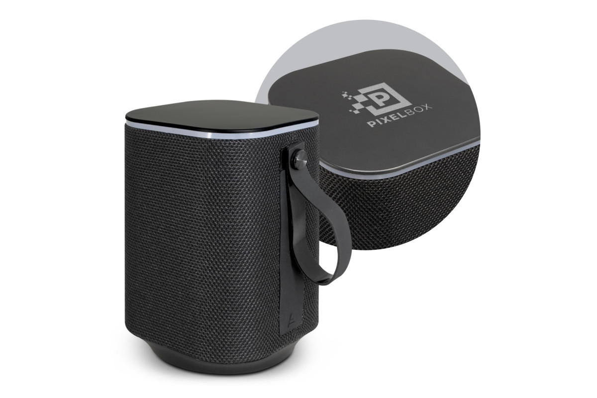 Extra-large deluxe 5W Bluetooth speaker which is compatible with all mobile devices that support Bluetooth. It is well suited for outdoor use and can also be used with an audio cable. The speaker has a colourful ambient light function with eight light display settings, a built-in microphone for phone calls, a silicone carry handle and music playback that can be controlled directly from the speaker. Lumos really attracts attention with its unique ability to brilliantly light up a brand. The artwork is laser engraved into the top of the speaker and illuminates when the light mode is on. Playing time is up to three hours and the speaker is easily recharged from a laptop, a power bank or a USB mains adapter. Lumos is presented in a black gift box with a Type-C cable, and an instruction leaflet.