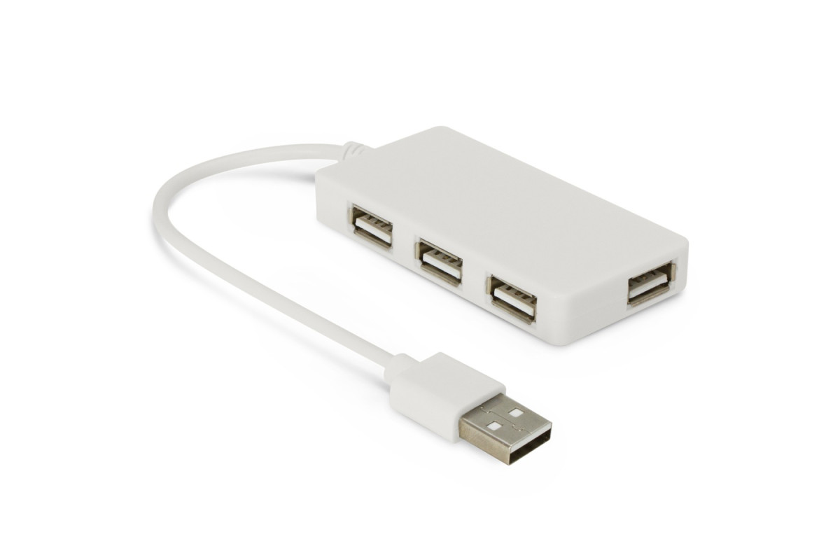 Rectangular USB hub with four ports and a USB 2.0 interface.
