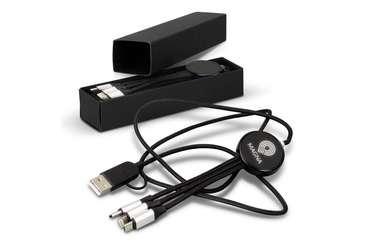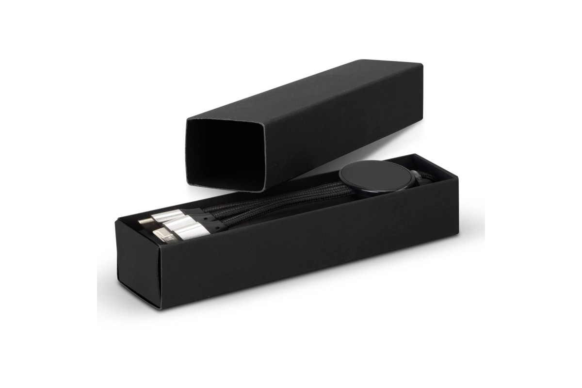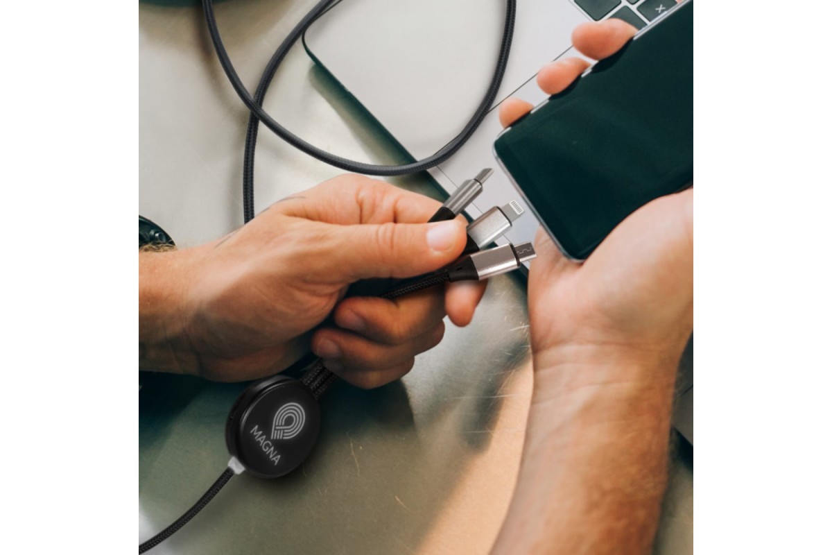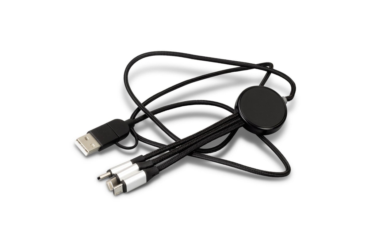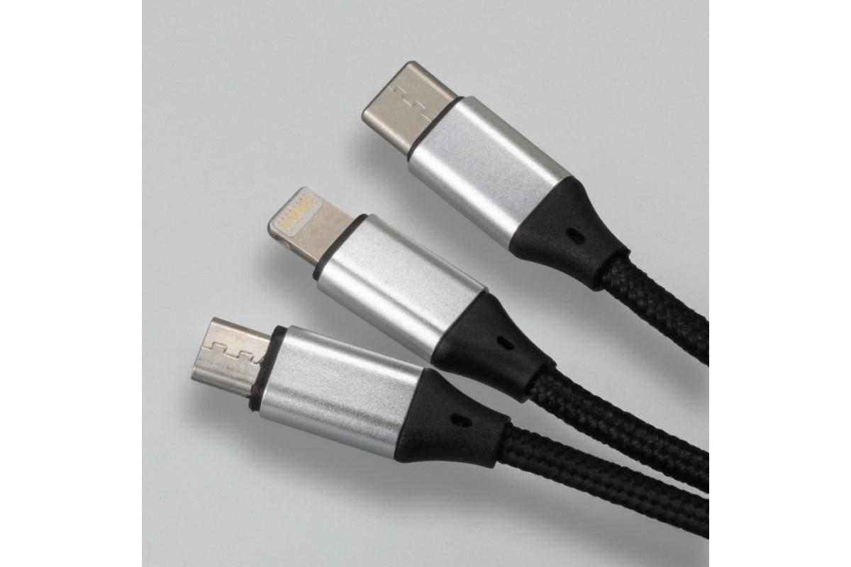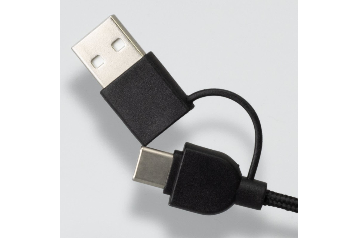 Illuminating 120cm Type-C charging cable with dual input USB-A and Type-C and triple output Type-C, Micro-B USB, and Lightning. Lumos features a built-in LED that illuminates the engraved branding when in use, and the braided cable increases durability. Features: * Illuminating 120cm Type-C charging cable * Dual input: USB-A and Type-C * Triple output: Type-C, Micro-B USB and Lightning * A built-in LED lights up the engraved branding when in use * Braided cable for added durability * Presentation: Black gift box