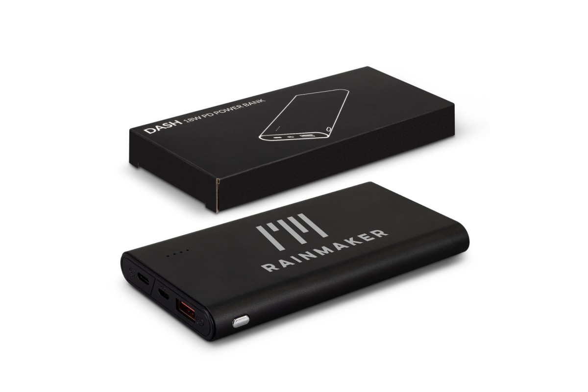 Impressive 10,000mAh power bank that delivers up to 18W PD quick charge power output. Capable of charging two devices at once, Dash has Micro-B and Type-C inputs and USB-A and Type-C outputs and features an LED power gauge. This high-performance power bank is presented in a printed black gift box. An optional EVA carry case and a triple connector cable are available on request.