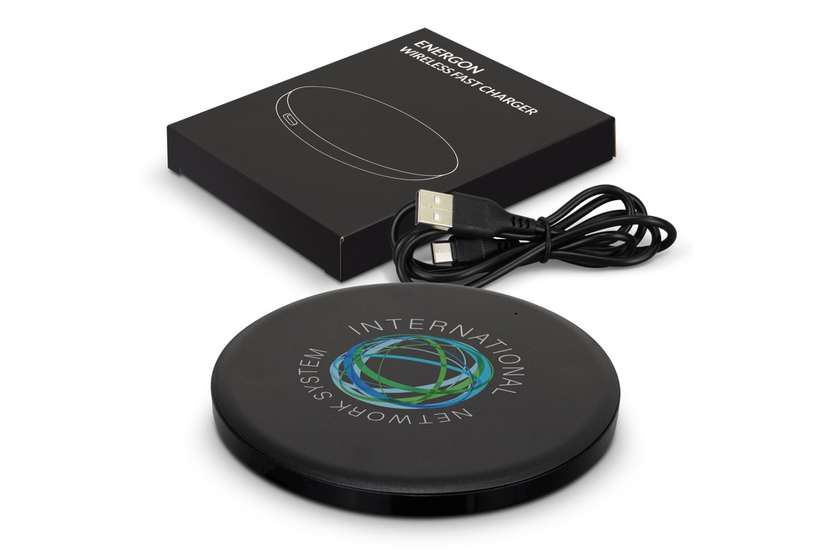 Handy 15W wireless charger with fast charging capability. The charger features a large charging pad and an LED light to indicate charging status. For convenient wireless charging, simply plug it into any USB port or mains adapter and place a compatible device on the charging pad. The charger includes a 100cm Type-C cable and will work with most modern devices. Energon is presented in a printed black gift box with instructions.