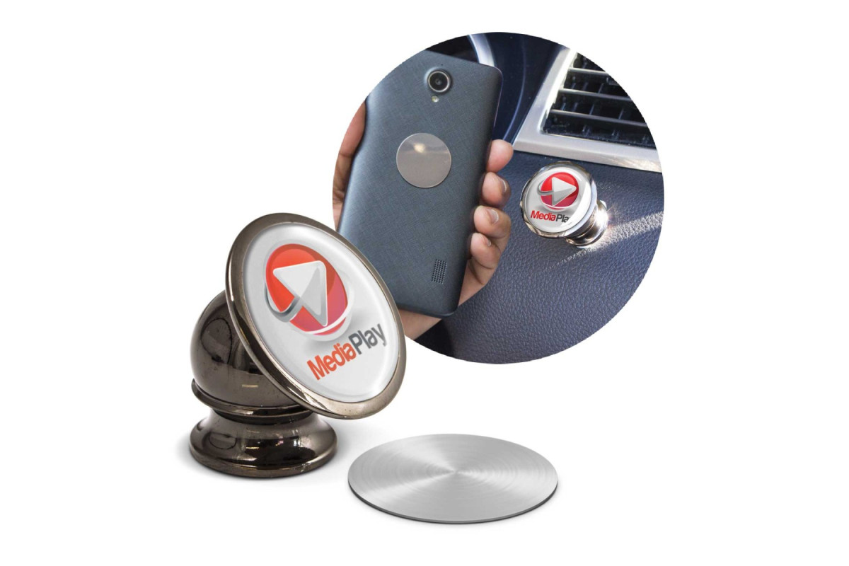 Multi-directional magnetic phone holder that attaches securely to a car dashboard to enable the phone to be used as a GPS. To establish the magnetic connection, a thin metal plate is attached to the phone or phone case. This is a proven concept which will not damage or affect the performance of the phone. Both the phone holder and the metal plate use strong 3M adhesive which wont leave marks if either is removed. Enzo is presented in a compact clear gift box along with two different size metal plates, spare adhesive circles, two surface cleaning pads and simple instructions.