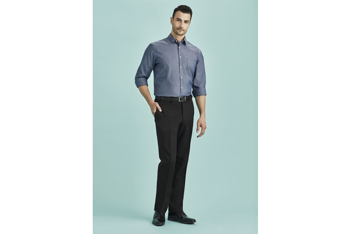 Features: Flat front and tapered through the leg. Waistband with stretch fusing. Internal security pocket on right front pocket, and two rear pockets.