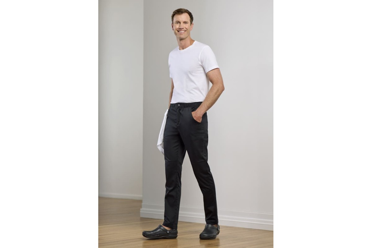 Features: Tapered fit in a stretch fabric Elasticated waist with drawcord, functional fly button and zip 2 Front shaped pockets and back welt pockets Tea towel tab on right hand side Welt pocket on left thigh Knee patches Fabric: 59% Cotton, 37% Polyester, 4% Elastane; Mid-weight stretch Twill; 215 GSM; UPF Rating 50+ Sizes: 77R - 107R