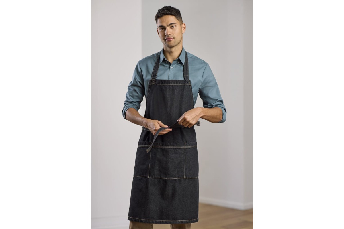 Features: Heavy-weight pure cotton Adjustable neck strap with antique Silver metal buckle Wide center front waist pocket with splits D-ring on right top edge of pocket Self-fabric neck and waist ties Free Size 82cm x 86cm Fabric: 100% Cotton; Stonewashed Cotton Denim; 330 GSM Sizes: Free Size 82cm x 86cm