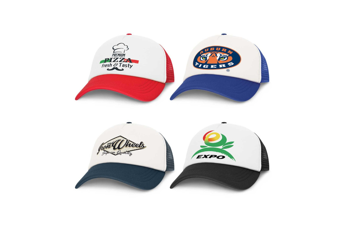 Stylish structured five panel trucker cap with a padded polyester front and breathable mesh panels on the side and back. It has a pre-curved peak, a sweatband and an adjustable snap back closure which allows one size to fit most people.
