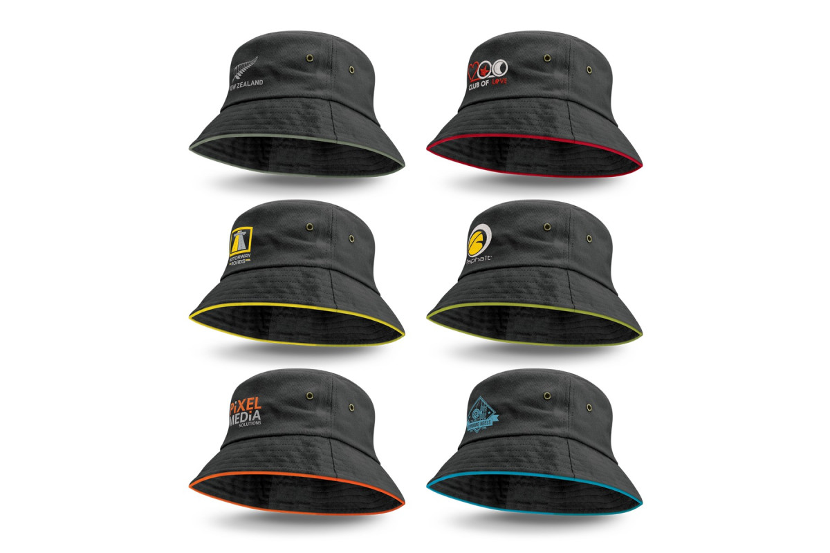 Premium cotton twill black bucket hat with coloured trim and a sweatband. The hat's material provides excellent UPF50 protection from the sun and complies with AS/NZS standards for sun protection. Bondi Bucket Hat is available in three sizes which will fit most people, including kids.