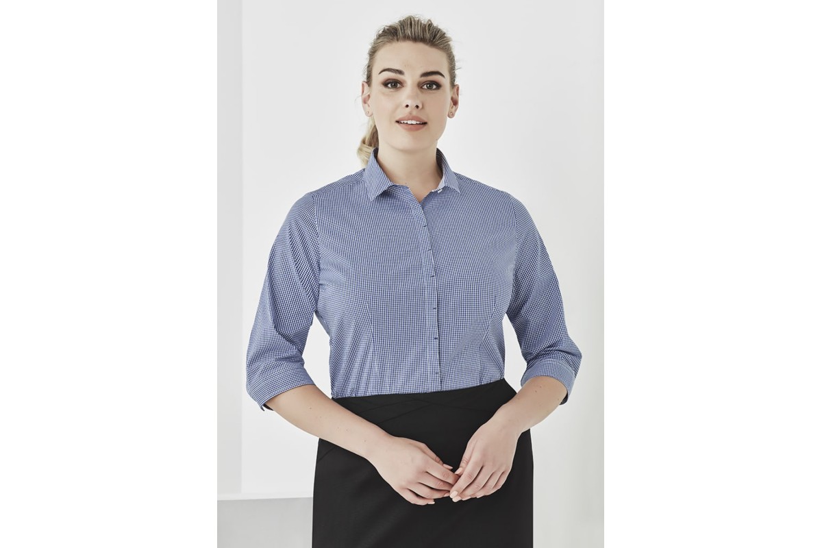 Cotton-rich fabric provides a soft hand feel, with the durability of polyester. Yarn dyed gingham check for a premium look, with added Elastane for comfort and stretch. Gentle machine wash and cool iron.