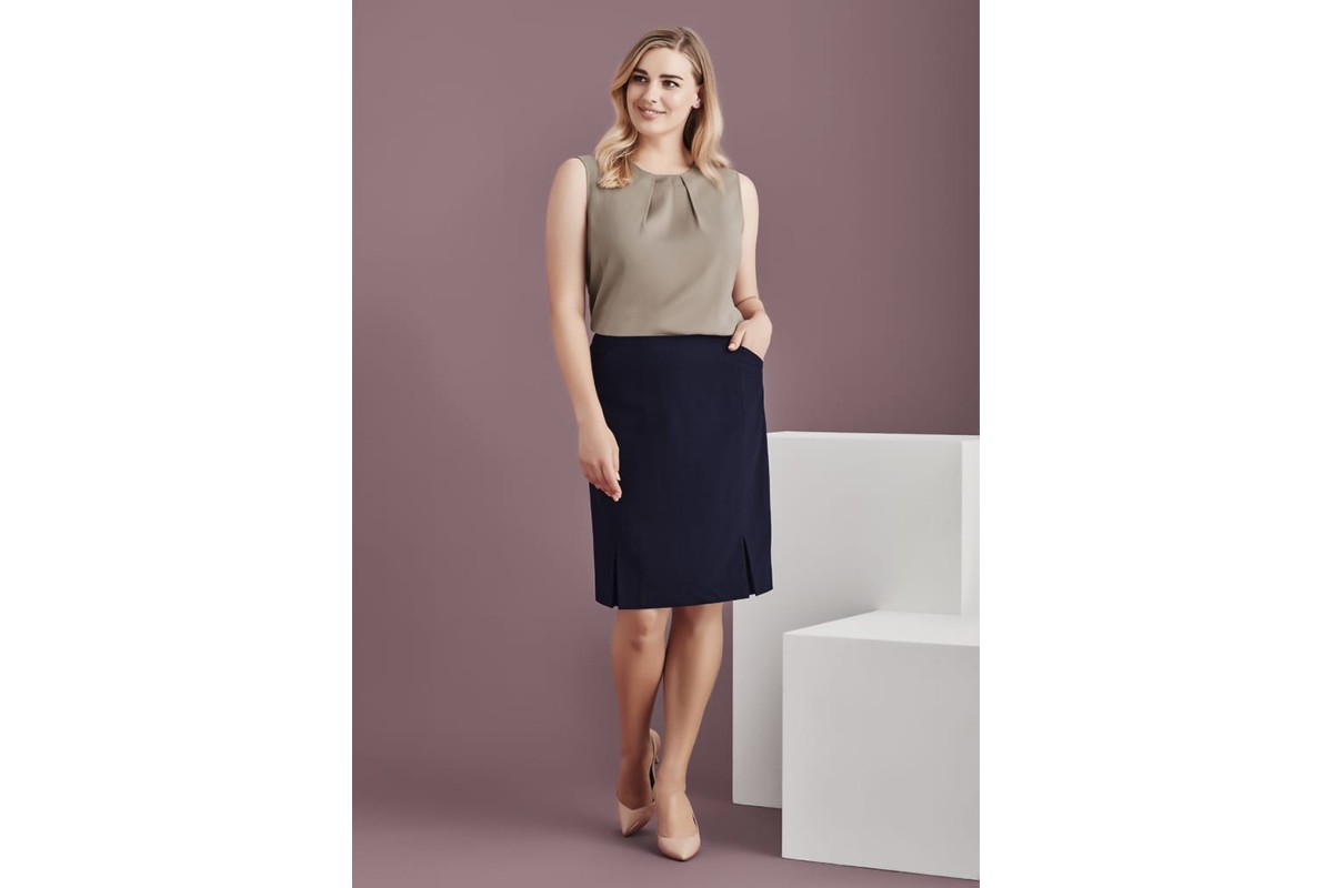 Features: Knife pleats on the front emphasize the skirt’s fluidity, whilst the back split adds comfort and ease of movement.