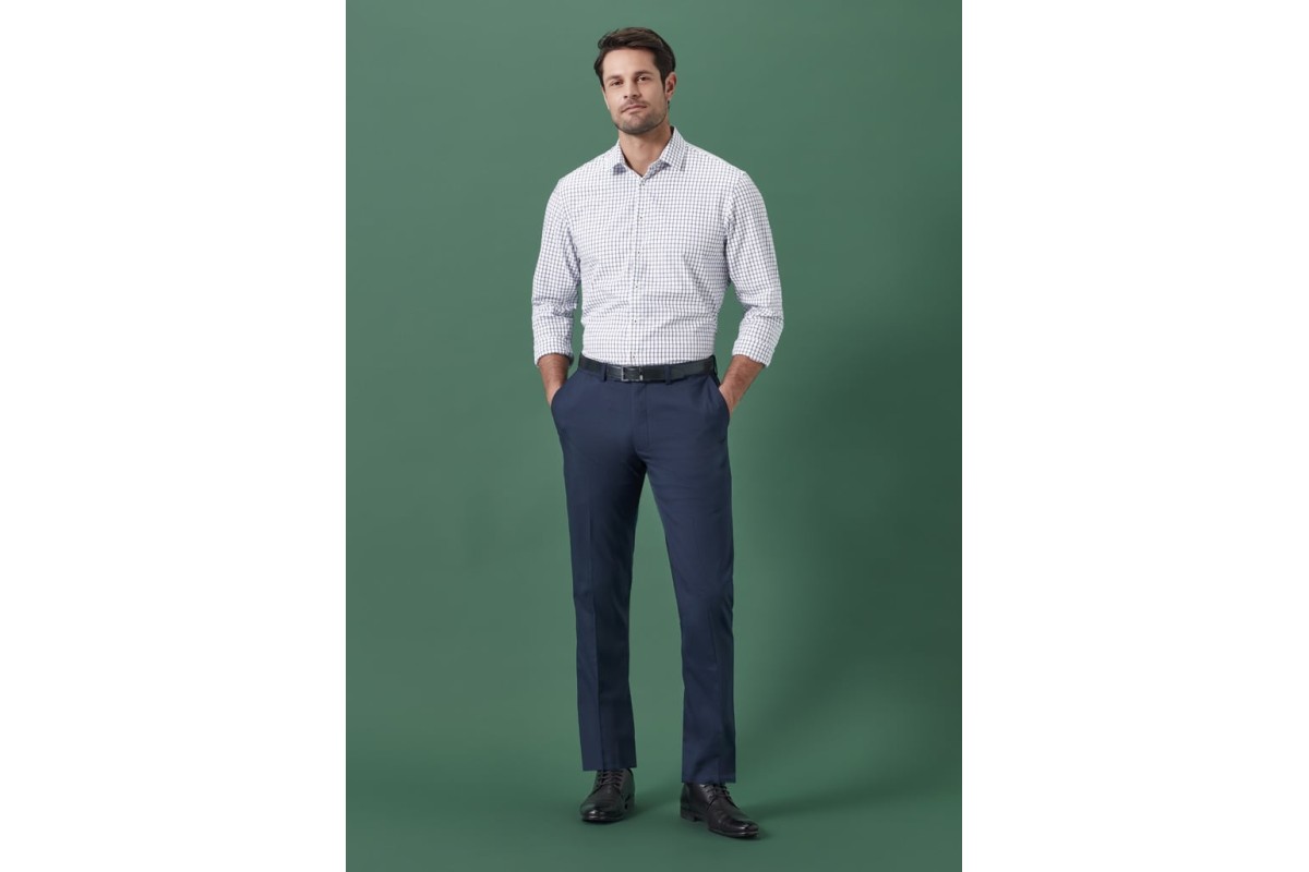 Features: Flat-front styling Pressed creases 2 Angled front side pockets Hidden secret stretch waist, perfect for those in between sizes 6 Belt loops allowing belt to sit comfortably at waist Waistband with inbuilt internal shirt grips 5cm Hem allowance for easy alterations Fabric: Renew Suiting: 77% Recycled Polyester, 20% Viscose, 3% Elastane; A lightweight fabric that's engineered to be an easy-care, machine wash-and-wear fabric with minimal creasing. Made for ease and versatility for when you are on the go. A conscious product choice, with 77% made from post-consumer recycled polyester. Sizes: 72R - 127R