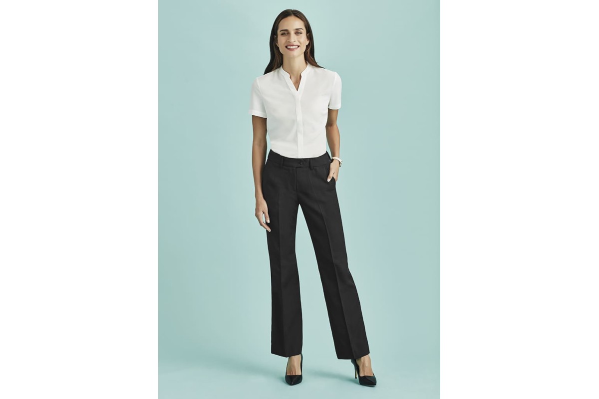 Features: A comfortable everyday pant, mid-rise waist with a waistband designed to sit just below the navel. Straight leg, front horizontal pockets with one pocket on the rear.