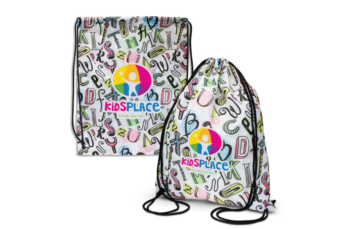 Robust medium-size drawstring backpack which is manufactured from 210D polyester and can be branded in spot colours or full colour on both sides at no extra cost. It has riveted metal eyelets at the base for added strength and black woven drawstrings. A production lead time of 20 working days applies to this product by air freight and larger orders can be sea freighted on request to reduce the freight cost.