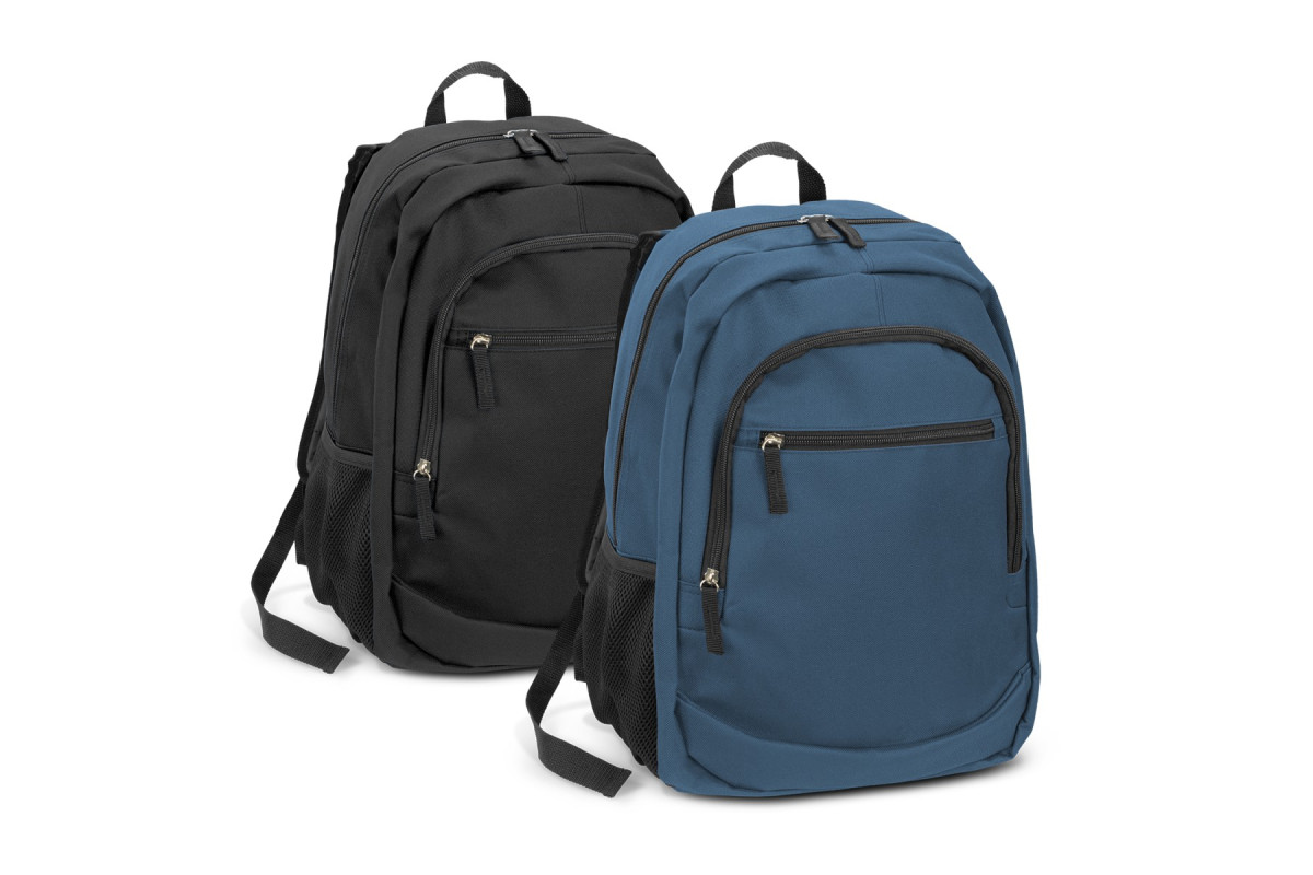 Robust backpack which is manufactured from 600D polyester. It has a main zippered compartment with an internal laptop sleeve and two zippered external pockets on the front. Other features include a padded back, adjustable woven shoulder straps, a woven carry handle, two mesh side pockets and woven zipper pulls. Features: * Robust 18L backpack made from 600D polyester * main zippered compartment with an internal laptop sleeve * Adjustable woven shoulder straps and woven carry handle