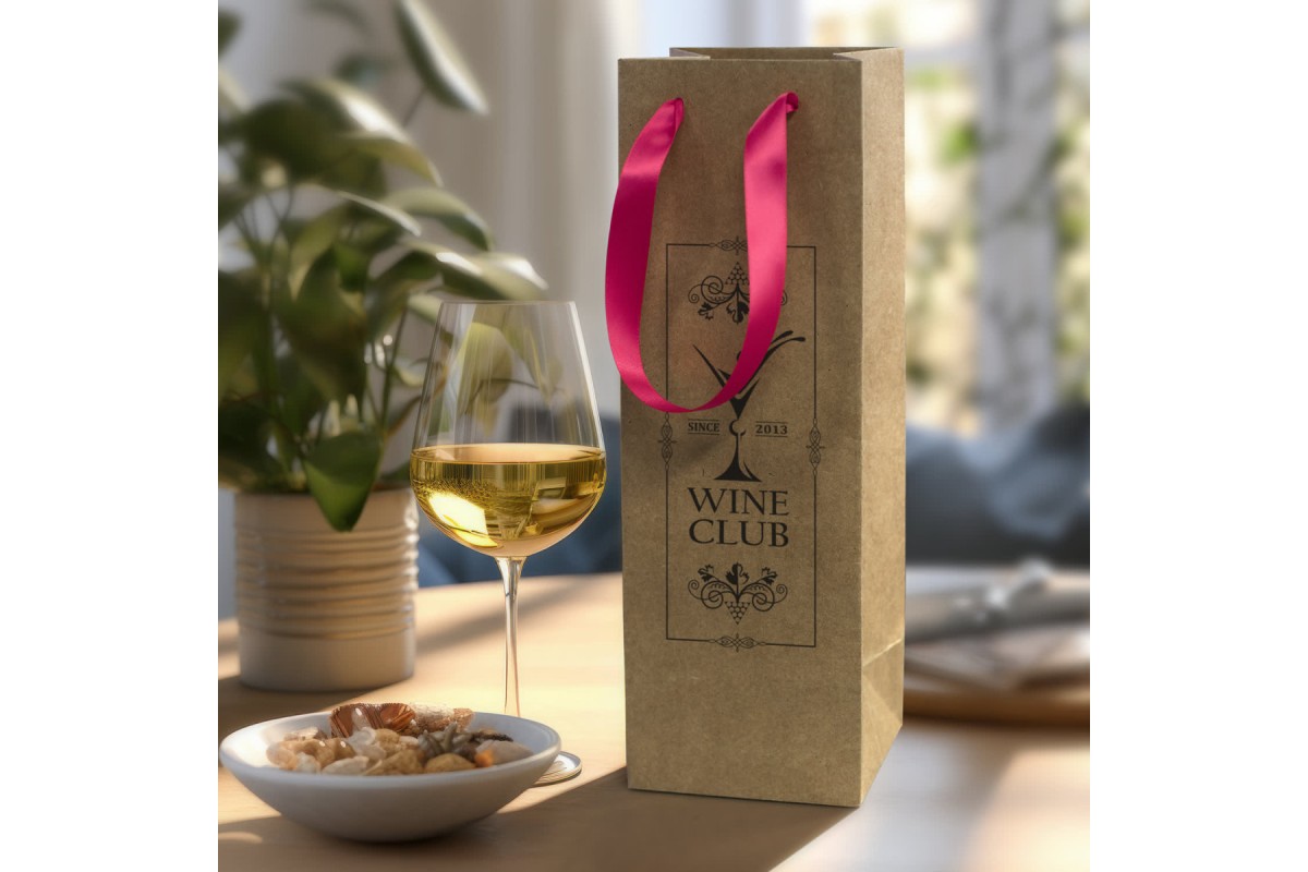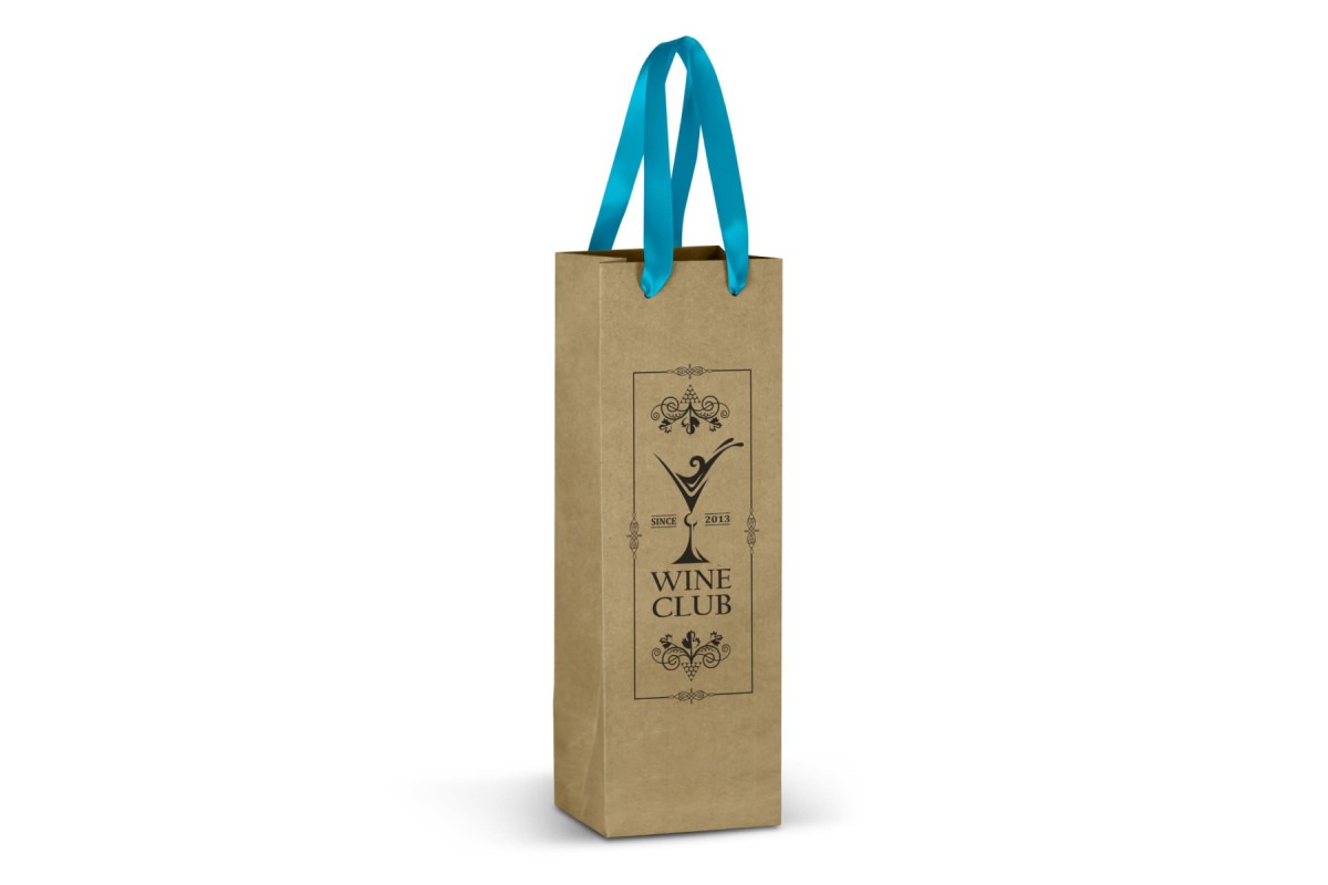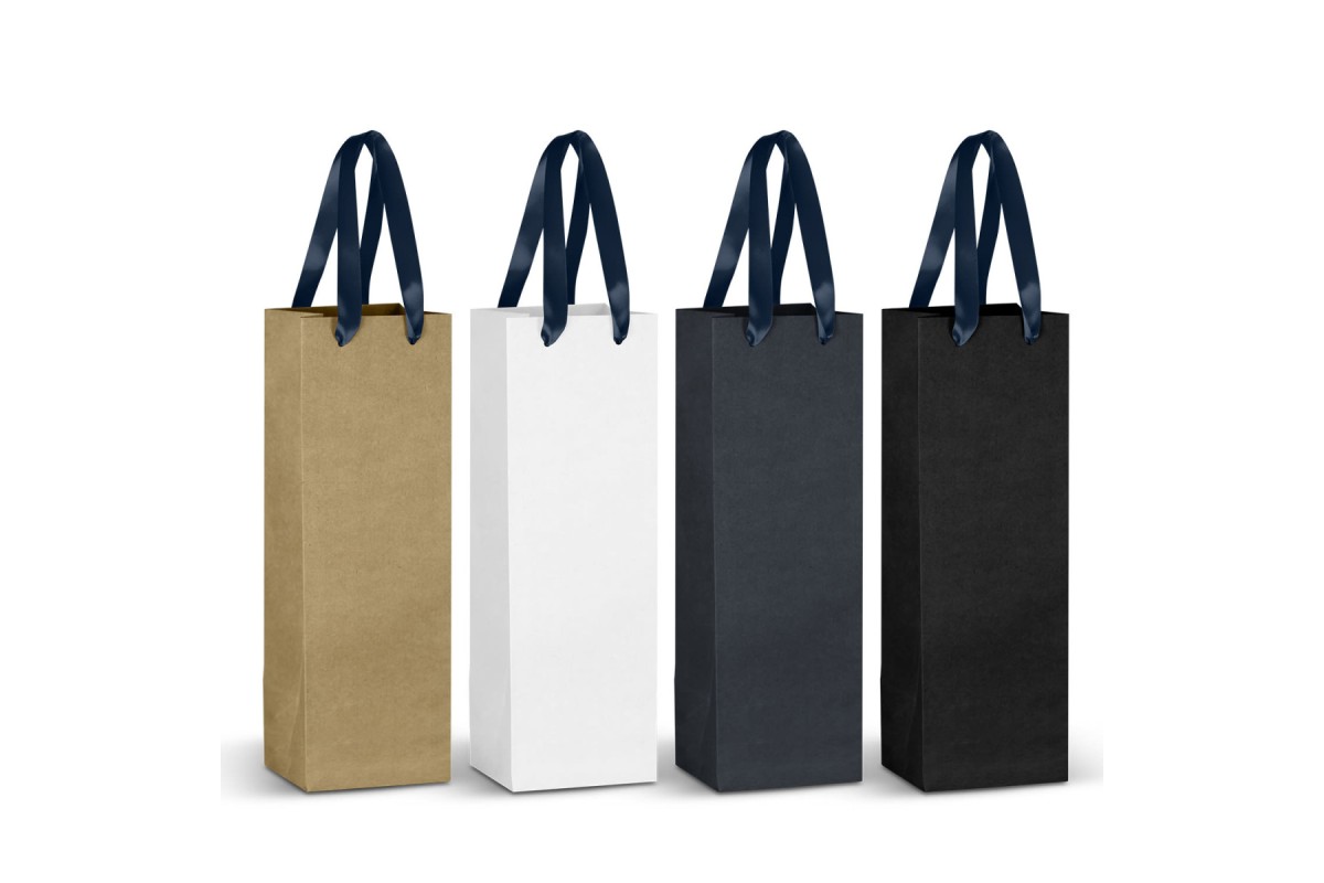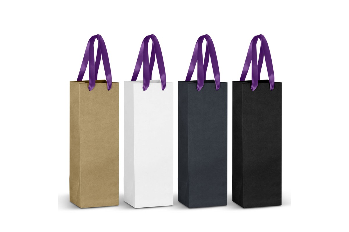 Wine carry bag made from 180gsm paper with coloured ribbon handles. The gusset and top edge are reinforced for added strength. This bag is perfect for wine and champagne gifting or presentation.