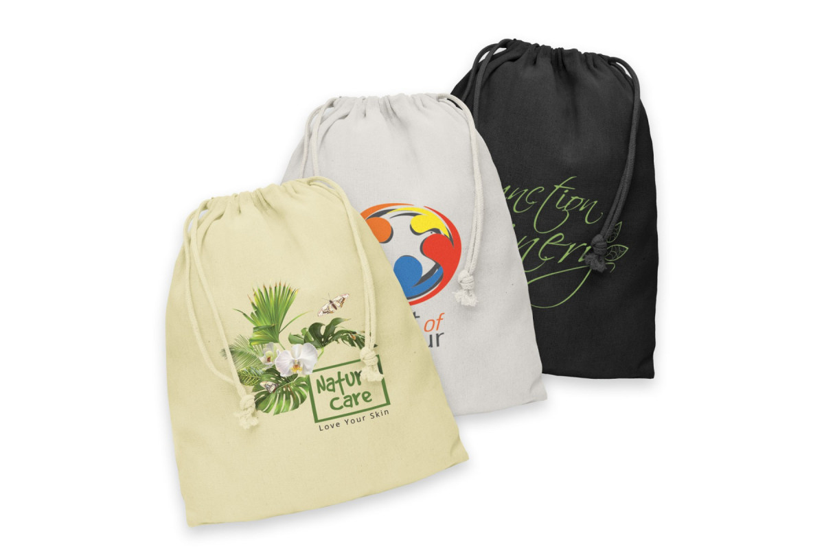 Large drawstring gift bag that is manufactured from 135gsm cotton.