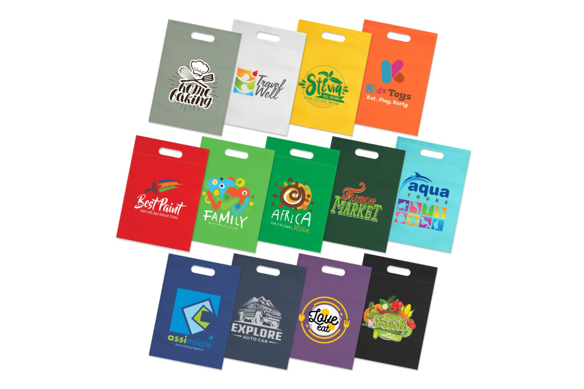 Small heat-sealed tote bag with die cut hand grips which is designed to hold A4 documents and catalogues etc. It is manufactured from 80gsm non-woven polypropylene material.