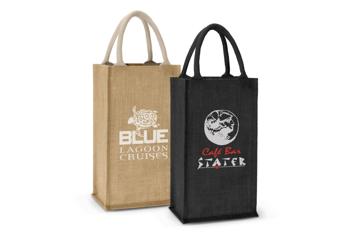 Two bottle wine carry bag with separated compartments which is manufactured from laminated natural jute with unbleached woven cotton handles. Features: * Laminated jute wine carry bag * Features unbleached cotton handles * Designed to fit two standard wine bottles